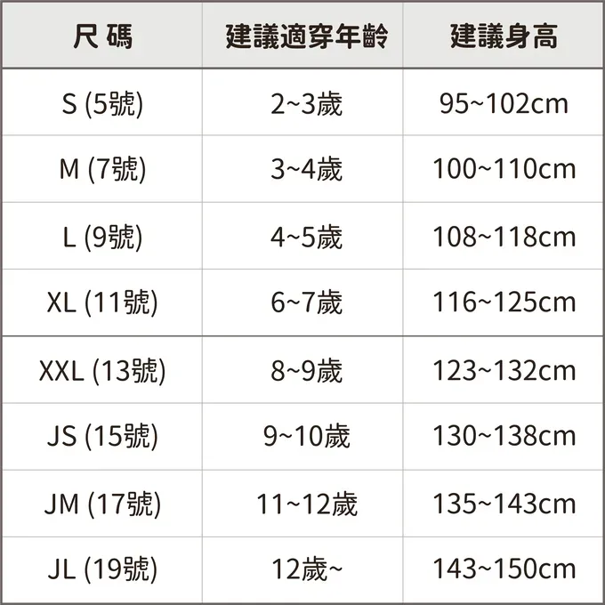 (上表為參考平均年齡/體型所制定,每位孩童成長狀況不同,請斟酌參考模特及尺寸資訊再行選購)