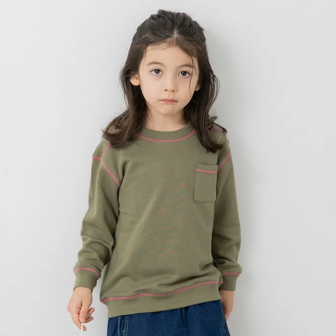 日本 Chil2 - 配色縫線簡約裏毛長袖上衣-軍綠x粉紅線