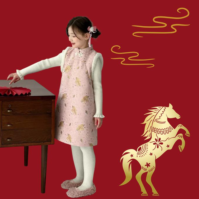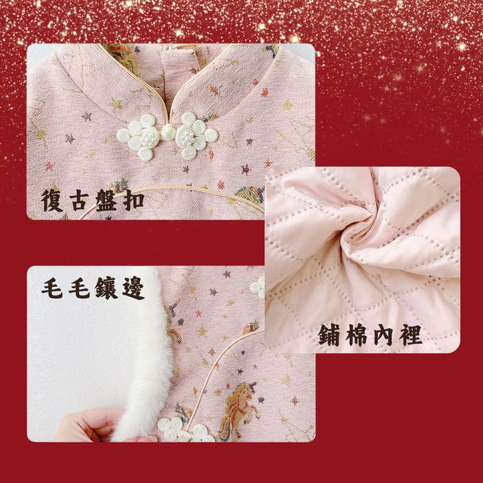 新中式旗袍領盤扣金絲織錦獨角獸花紋無袖洋裝-拜年新年戰袍-背心洋裝-浪漫粉