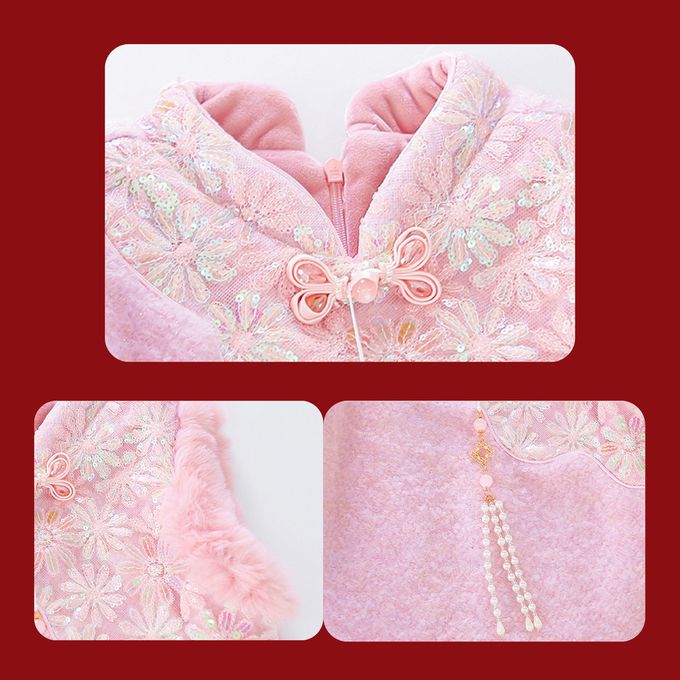 甜美新中式旗袍領七彩亮片花朵洋裝贈珠鏈斜背包-拜年新年戰袍-洋裝+內搭+珠鏈斜背小包-甜美粉
