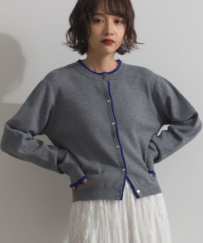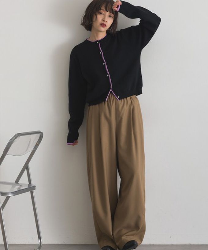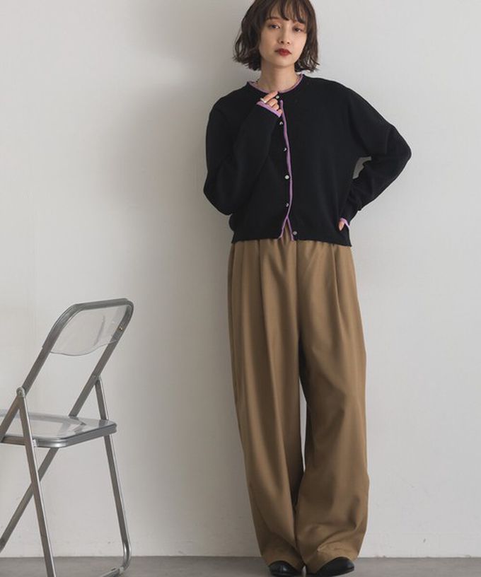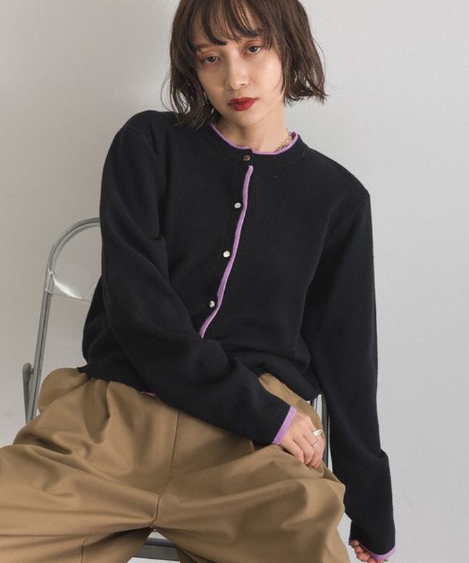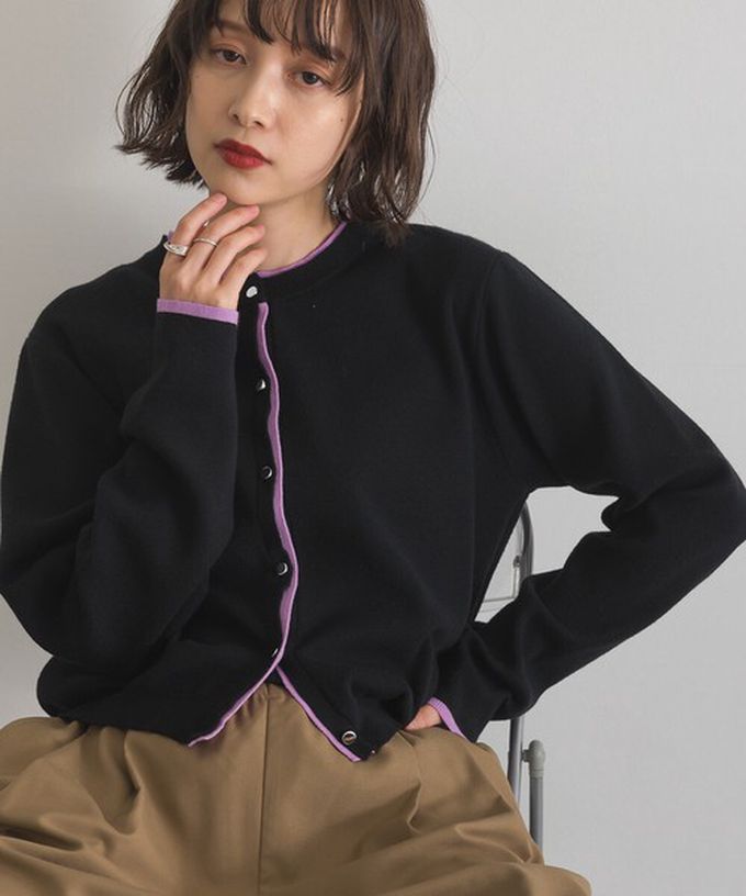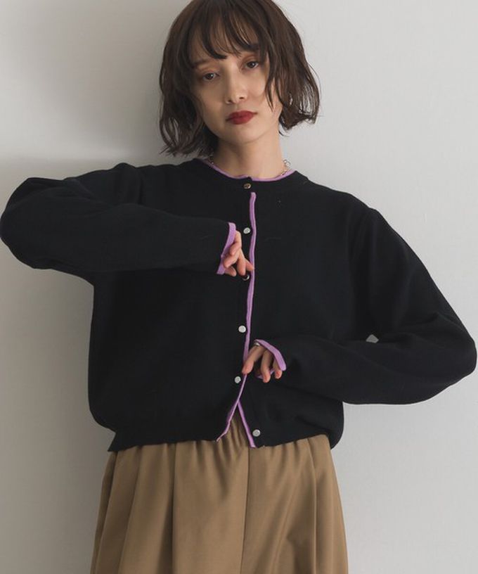 日本 ELENCARE DUE - 明亮配色滾邊短版針織開襟衫-黑x薰衣草
