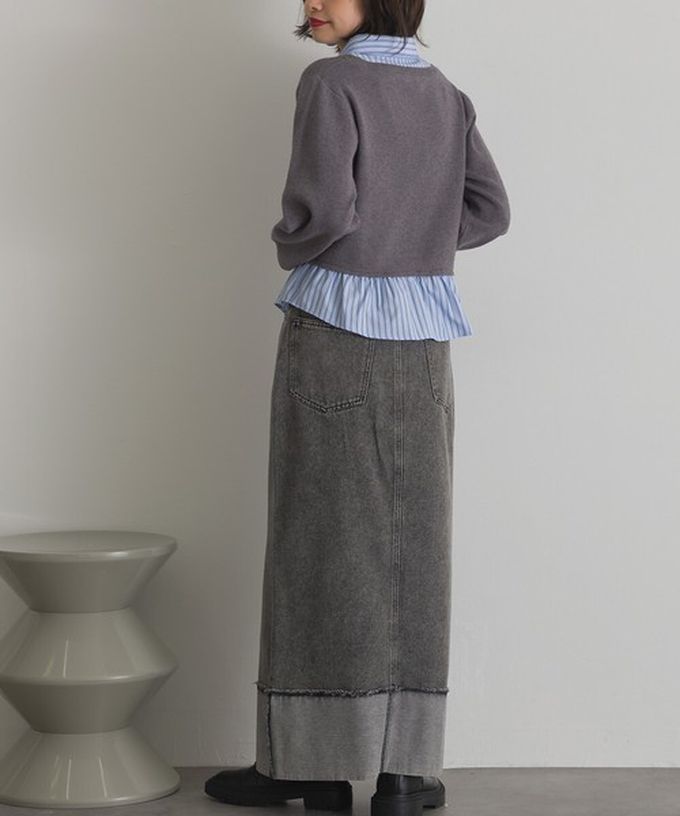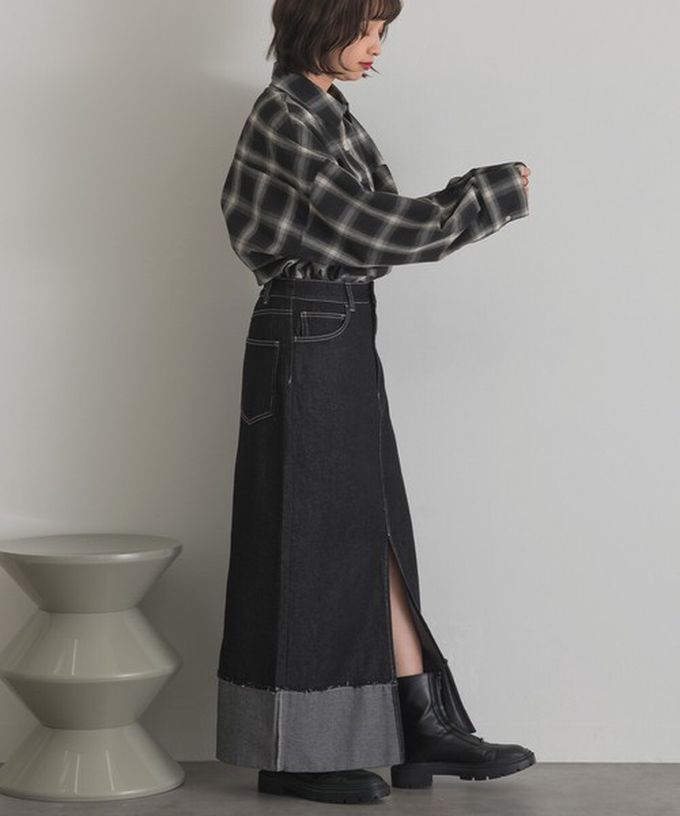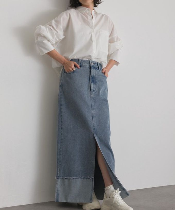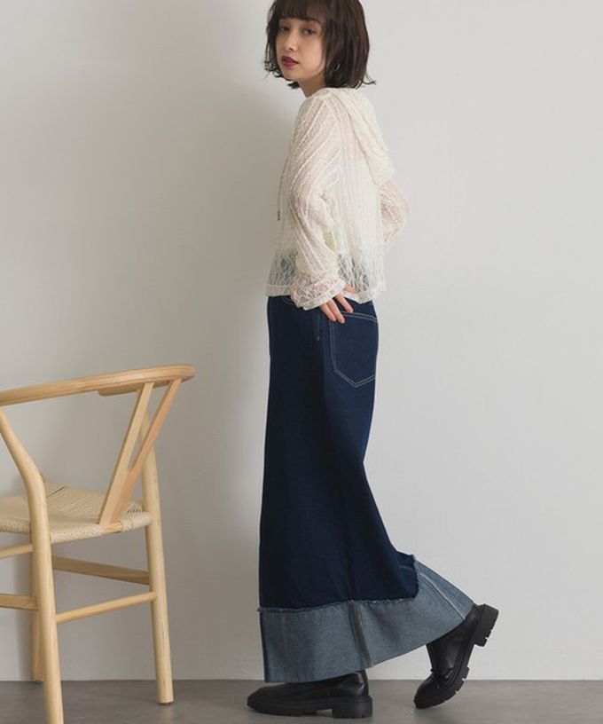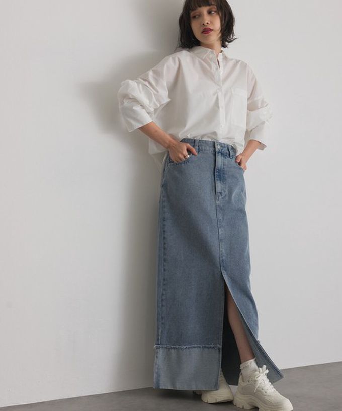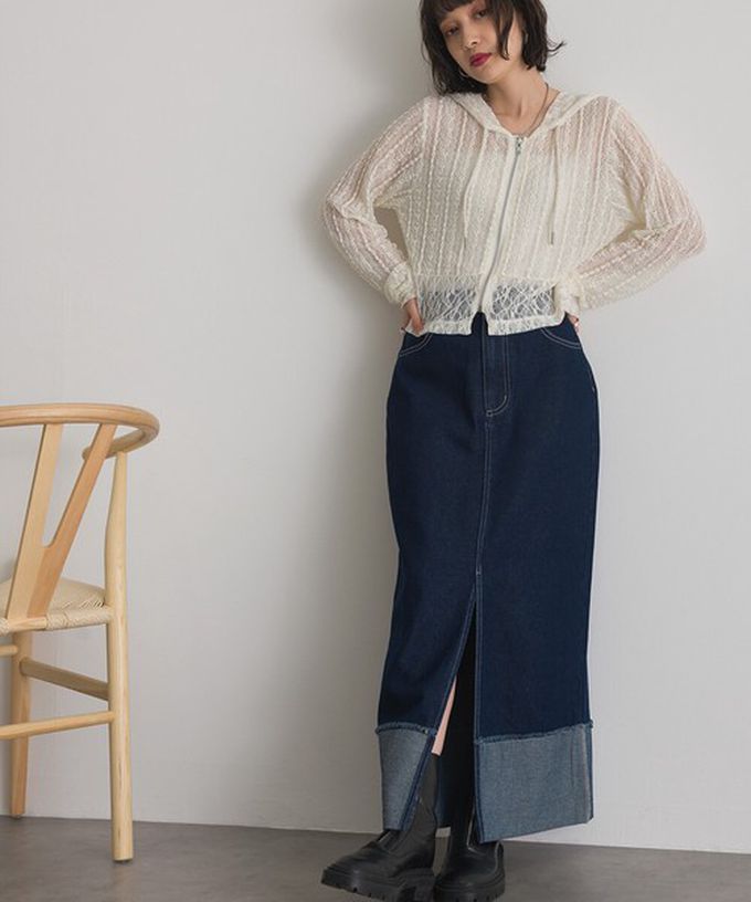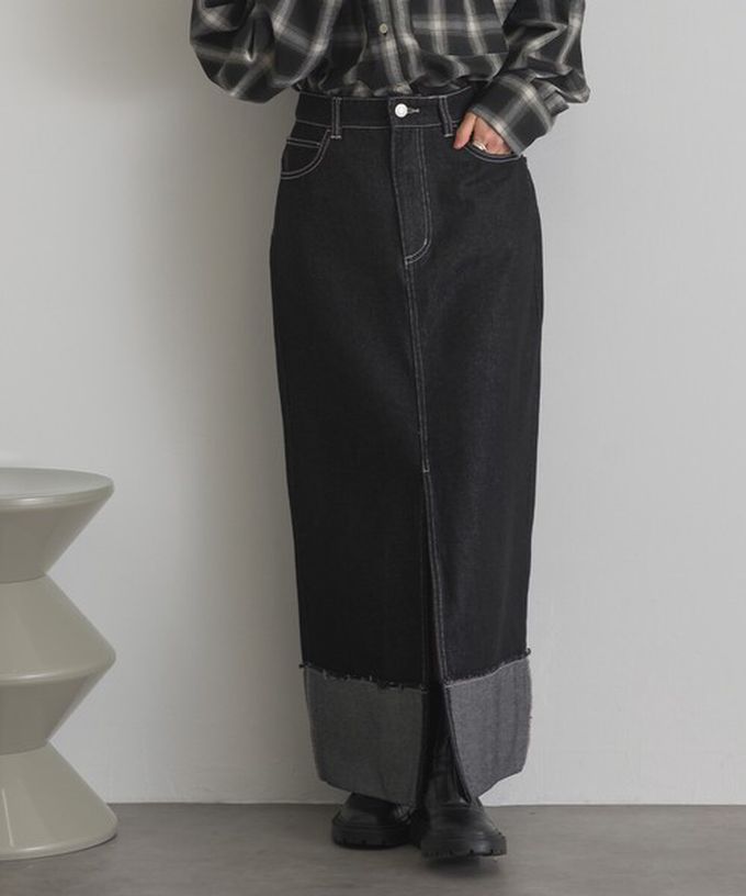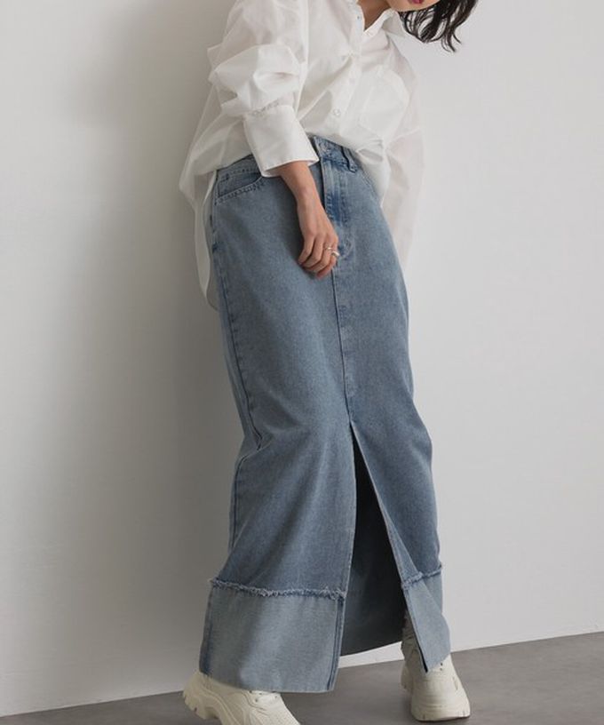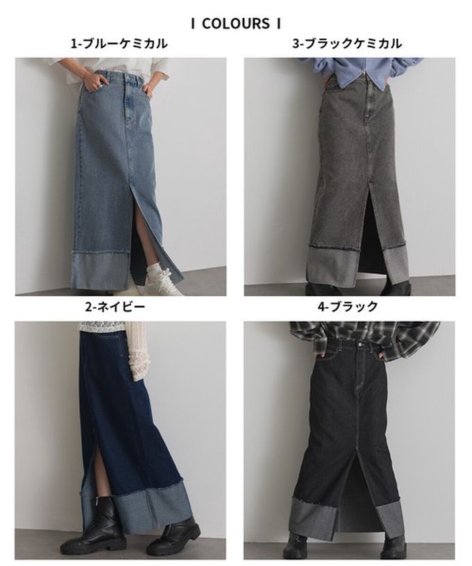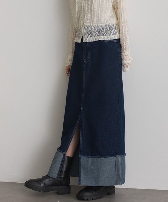 日本 ELENCARE DUE - 10oz抽鬚摺邊俐落前開叉牛仔長裙-海軍藍