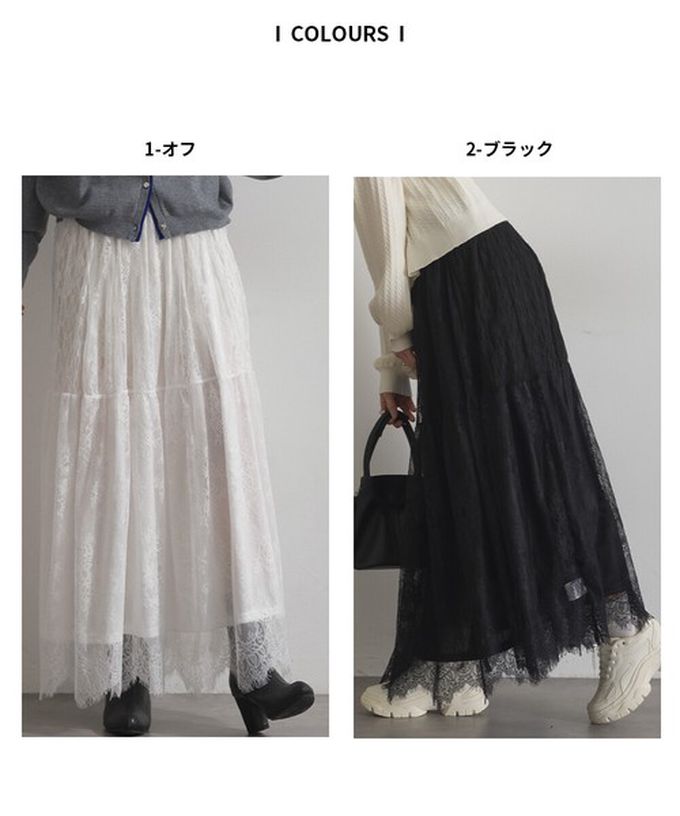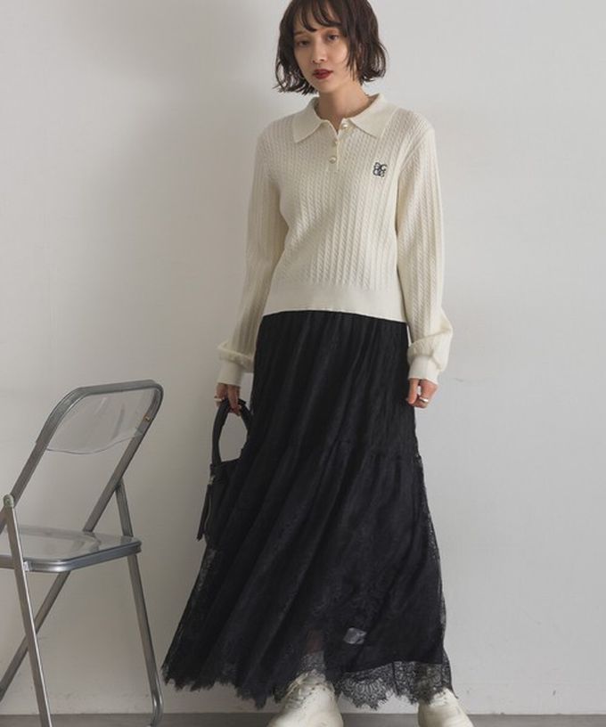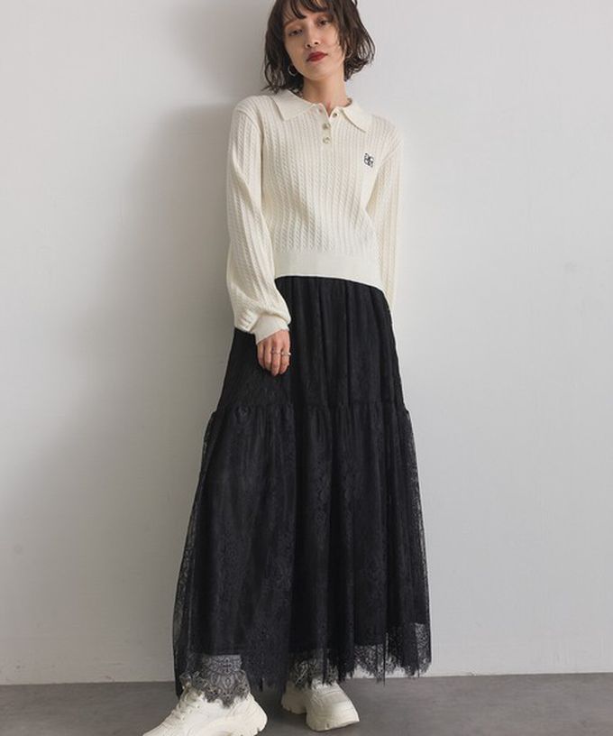 日本 ELENCARE DUE - 奢華睫毛蕾絲飄逸長裙(2件式)-黑