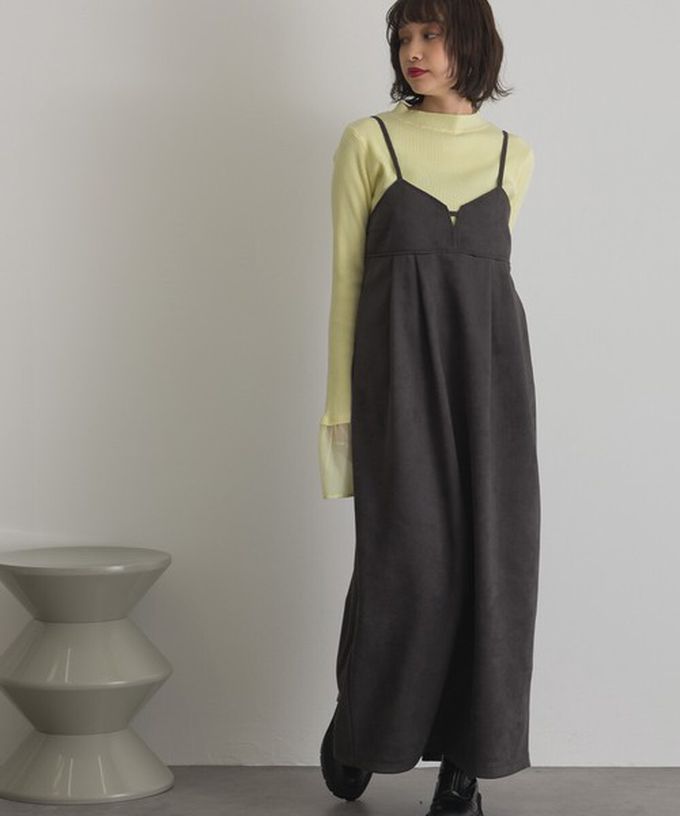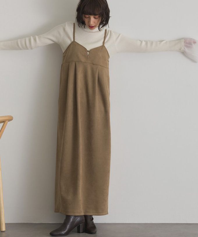 日本 ELENCARE DUE - 柔美垂墜感優雅絨面吊帶洋裝-卡其棕