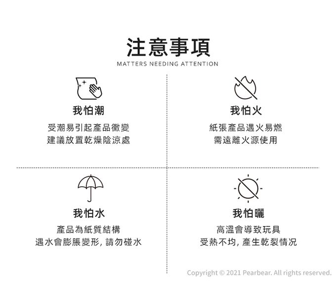 注意事項:為維護兒童安全,請在成人監督下使用,本玩具內 含小物件,有銳邊或尖端,或者兩者皆有,不適合 未滿3歲兒童使用,且應避免吞食造成窒息。為避 免嬰兒或兒童產生窒息之危險,請於拆卸後,立即 將塑膠袋遠離嬰兒及兒童。請遠離火源。