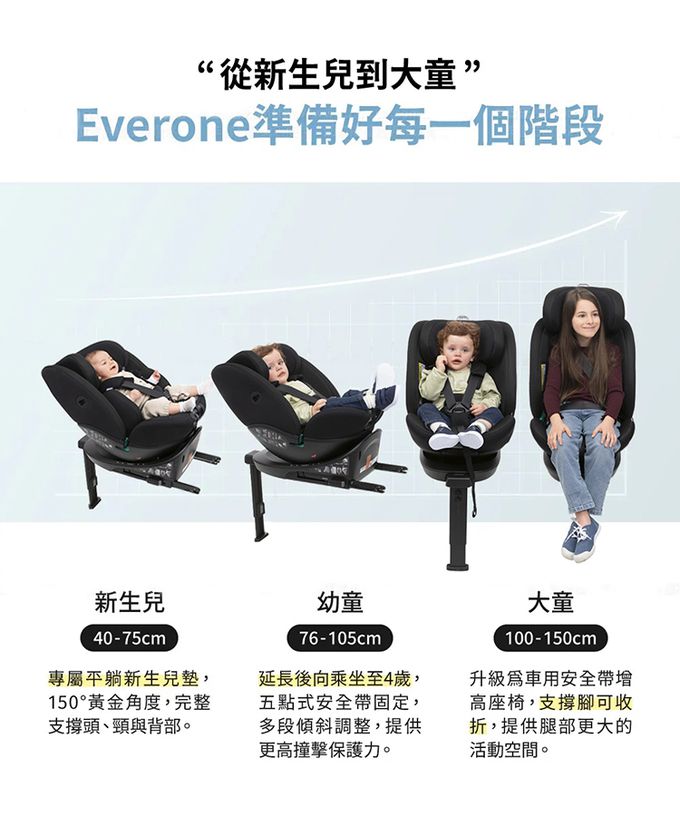 適用身高:《新生兒~4歲》後向乘坐 40-105cm;《2歲~4歲》前向乘坐 76-105cm;《4歲~12歲》前向乘坐 100-150cm