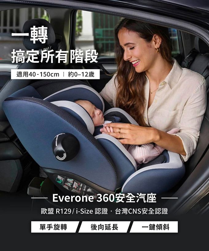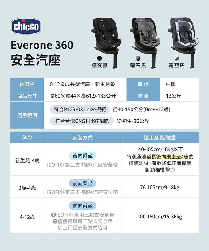 注意事項:【商品規格】 適用年齡:《新生兒~4歲》後向乘坐 40-105cm / 18kg以下;《2歲~4歲》前向乘坐 76-105cm / 9-18kg;《4歲~12歲》前向乘坐 100-150cm / 15-36kg 主要材質:聚酯纖維、軟質泡棉、聚丙烯、聚醯胺、聚甲醛、金屬 商品尺寸:60x44x61.9-133cm 重量:13kg 產地:中國 商品檢驗標識號:R33945 【注意事項】 ● 使用此兒童保護裝置時,不可置於配備正面安全氣囊之座位。且不可使用除使用說明書中所標註以外之其他受力點。 ● 前向安裝:勿提供2歲以下兒童乘坐;超過2歲兒童,仍宜儘量使用後向安裝(詳細請參考使用說明書說明)。 ● 請勿將兒童單獨留在汽座上。 ● 詳情請參閱使用說明書。