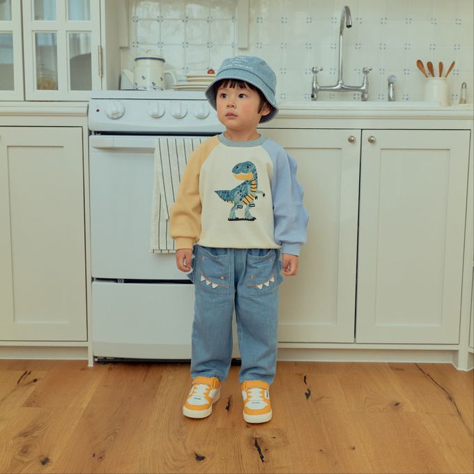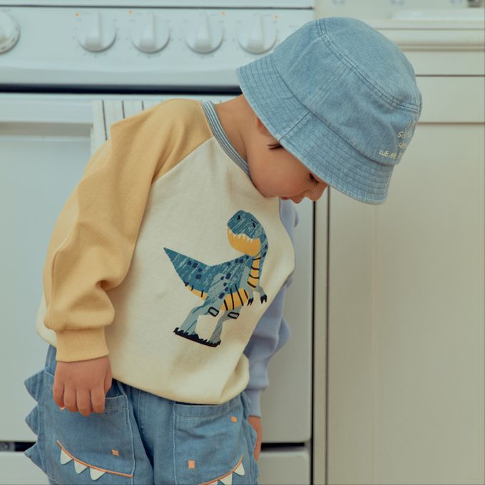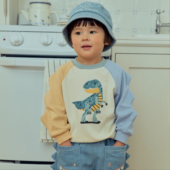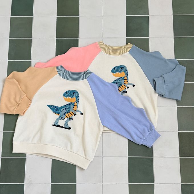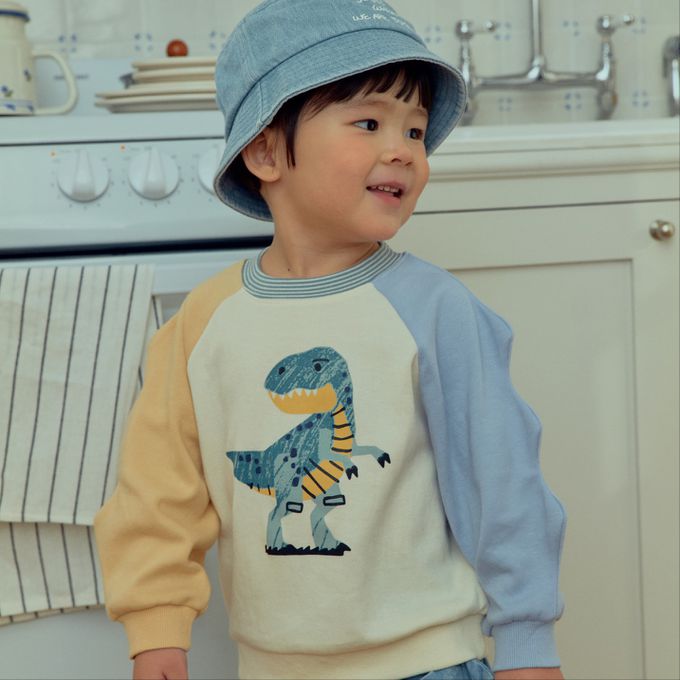 • 品名:First Blue 童趣恐龍插畫拼色長袖大學T