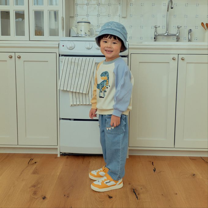 韓國南大門童裝 - First Blue 童趣恐龍插畫拼色長袖大學T-芥黃X淺藍
