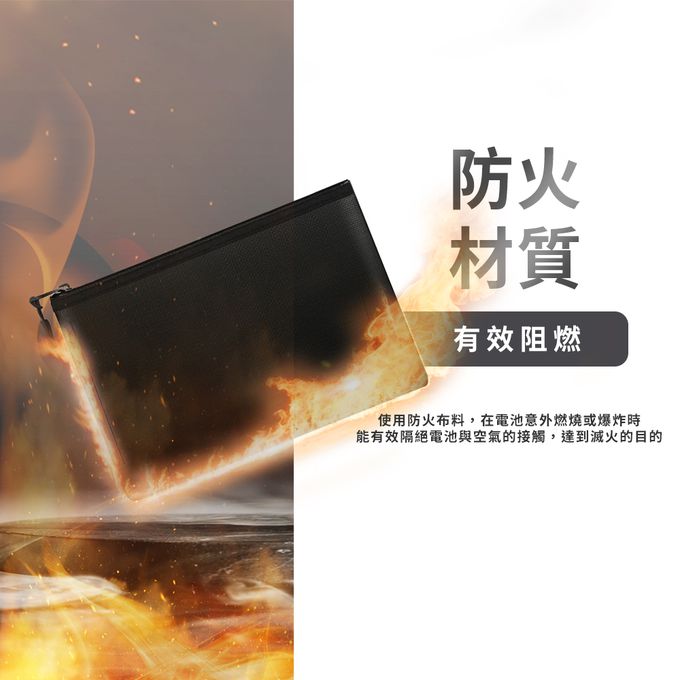 *使用四層防火布料,在電池意外燃燒或爆炸時能有效隔絕電池與空氣的接觸,達到滅火的目的