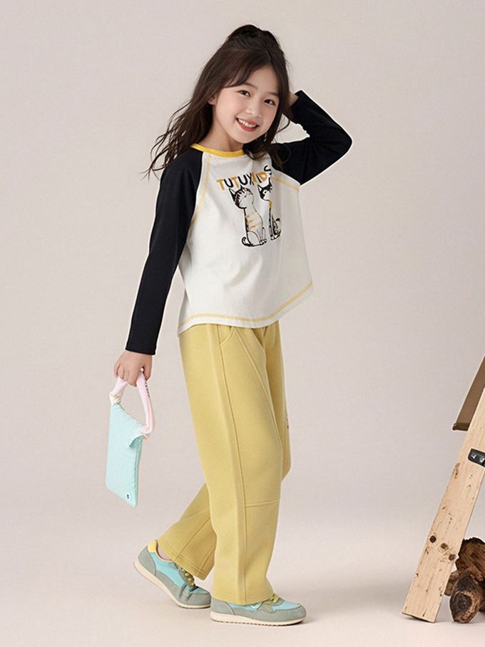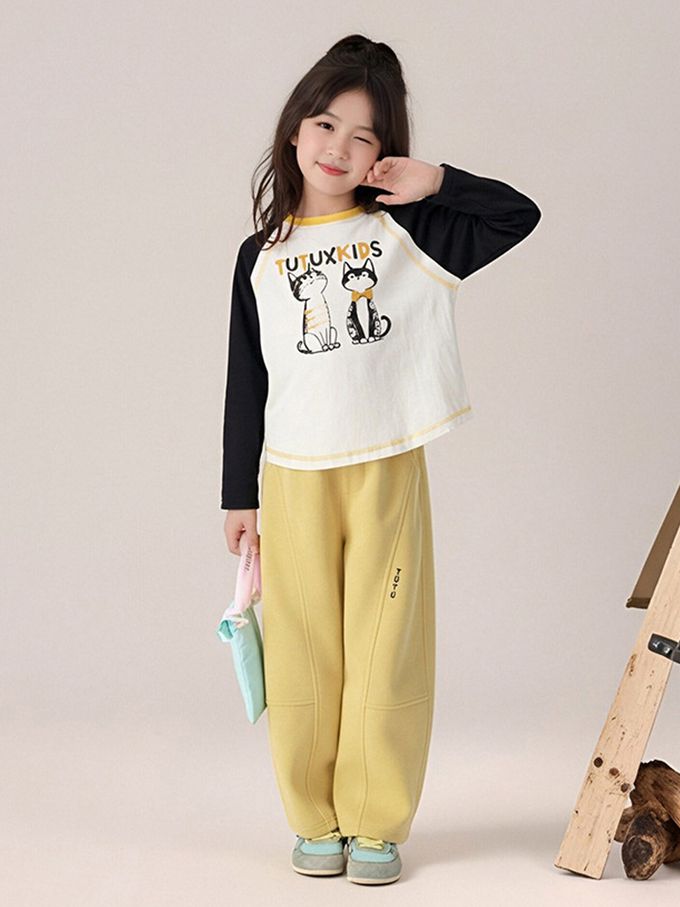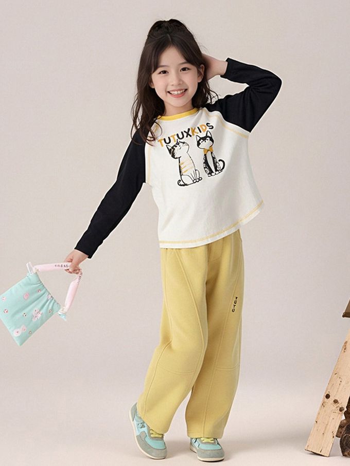 彈性拼色長袖上衣-可愛印花-黑色