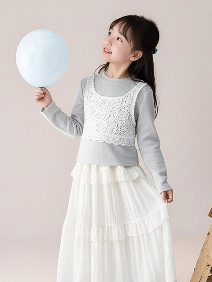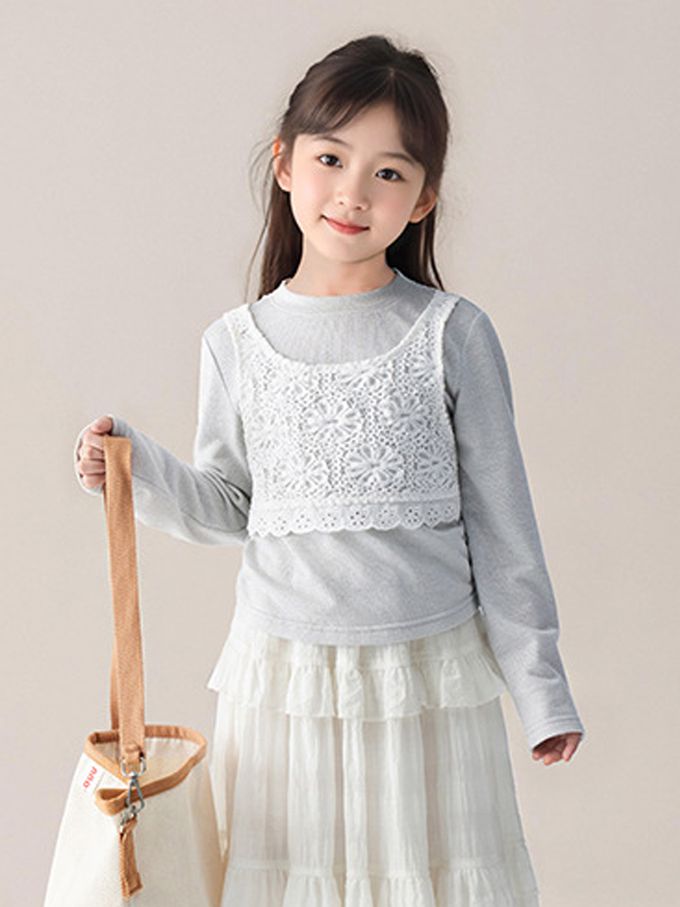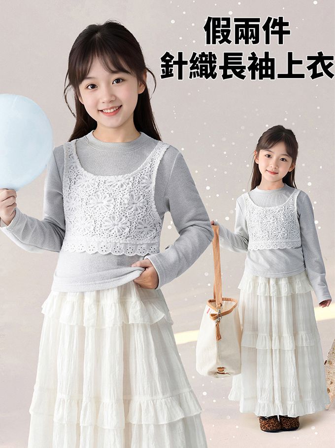 假兩件針織長袖上衣-蕾絲拼接-藍灰