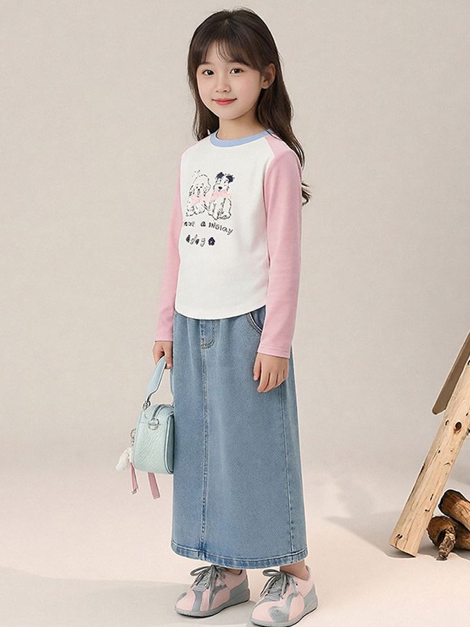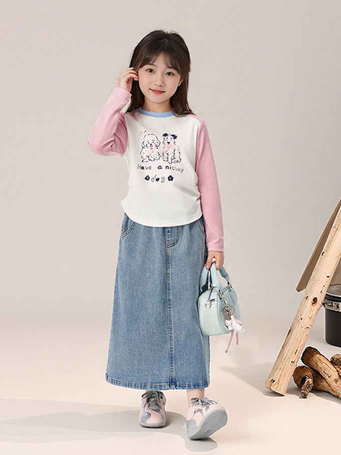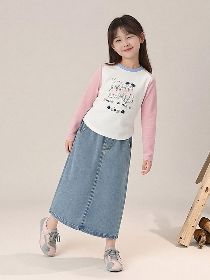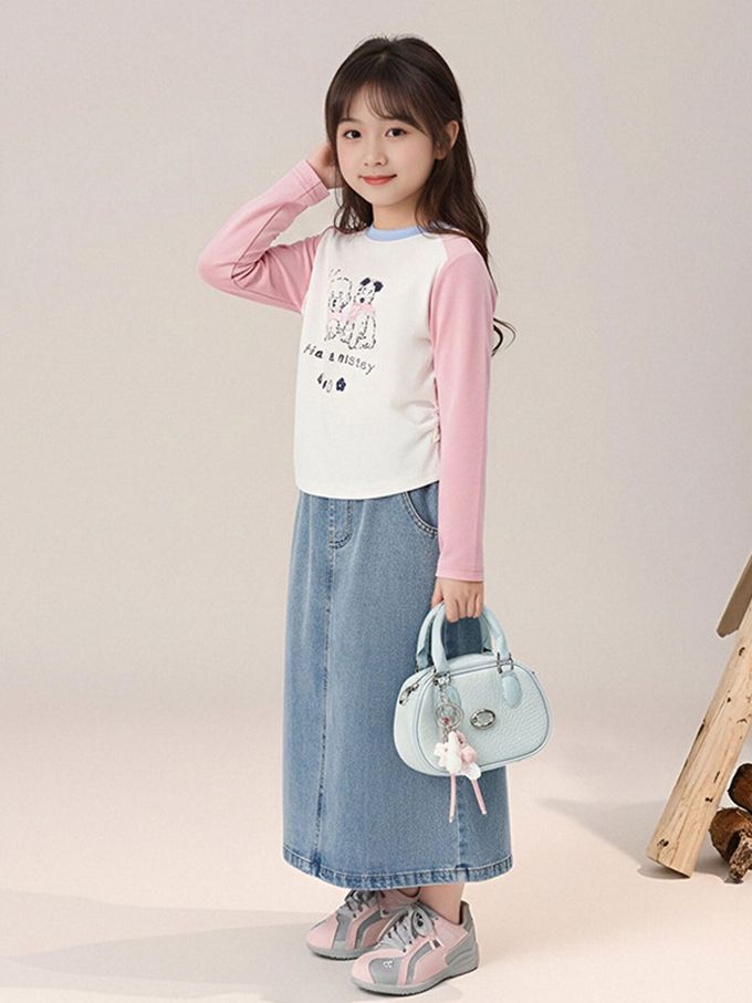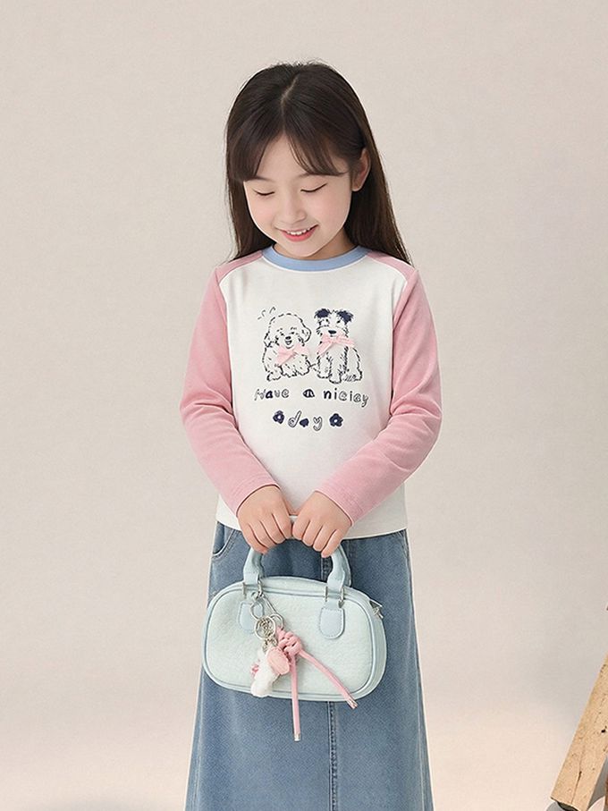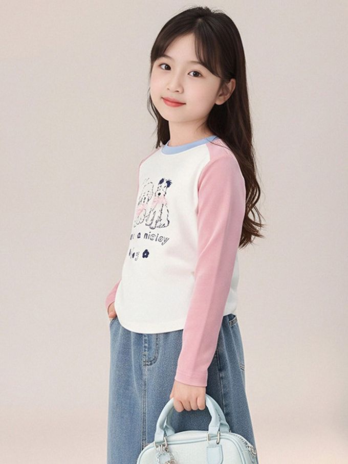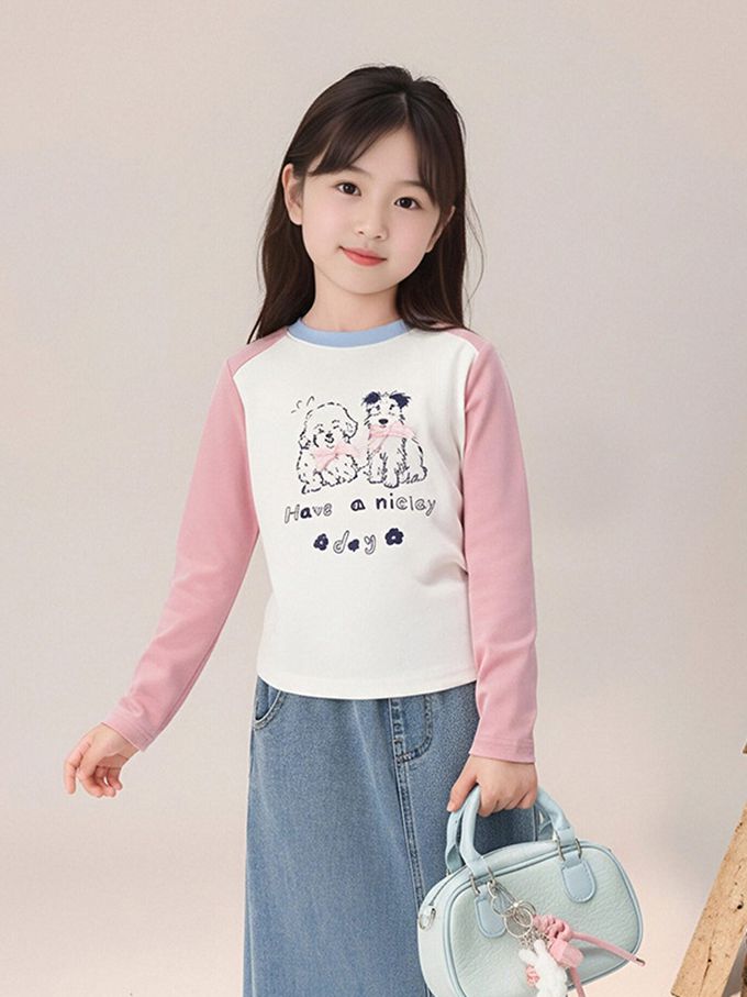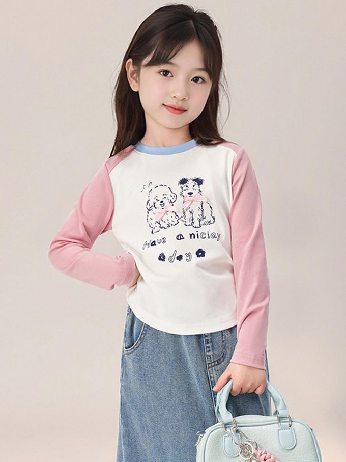 側抓皺撞色長袖上衣-萌趣印花-粉色