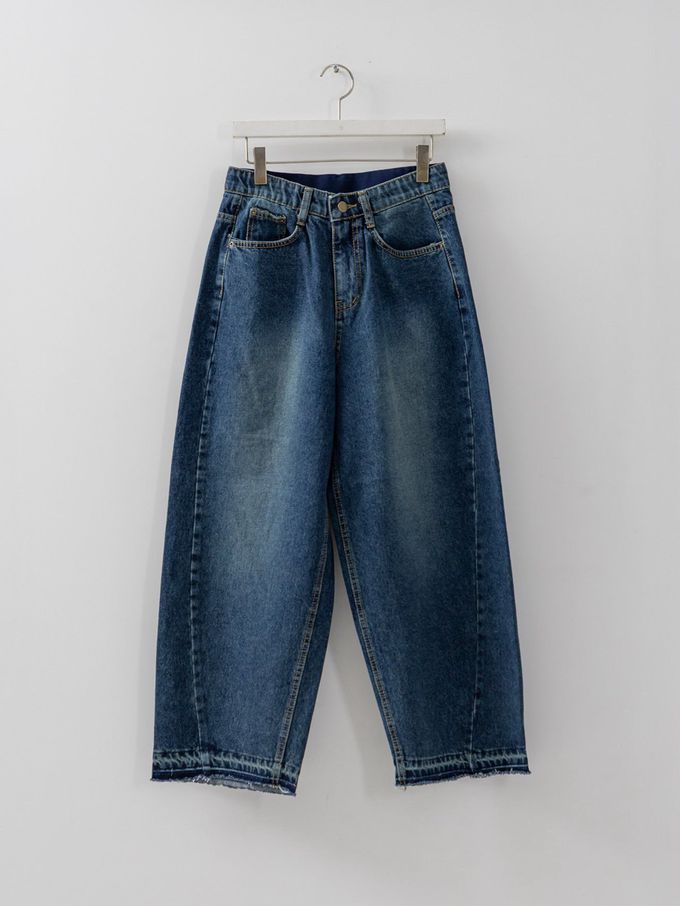韓國女裝連線 - EDITION 彈性腰質感刷色抽鬚丹寧哈倫褲-深藍
