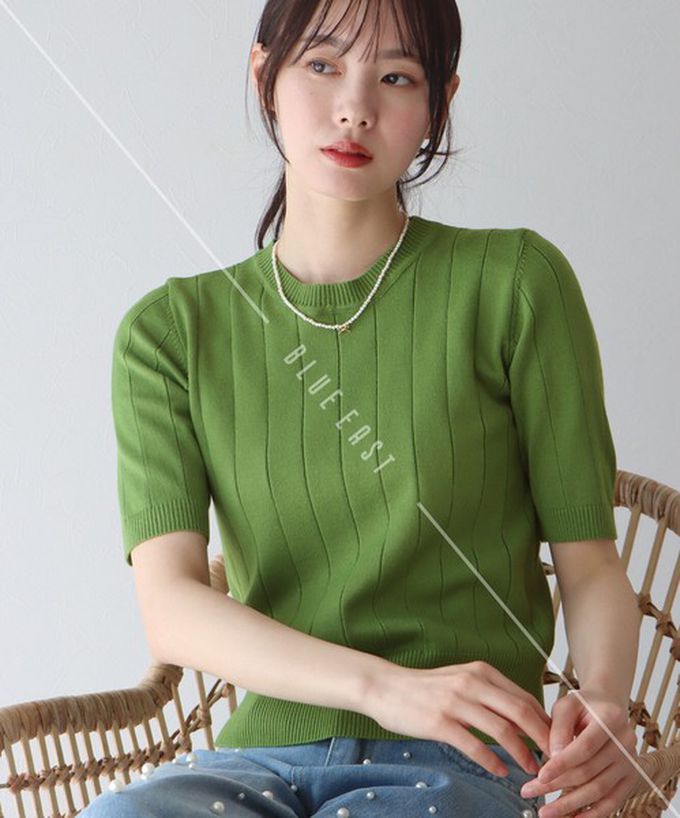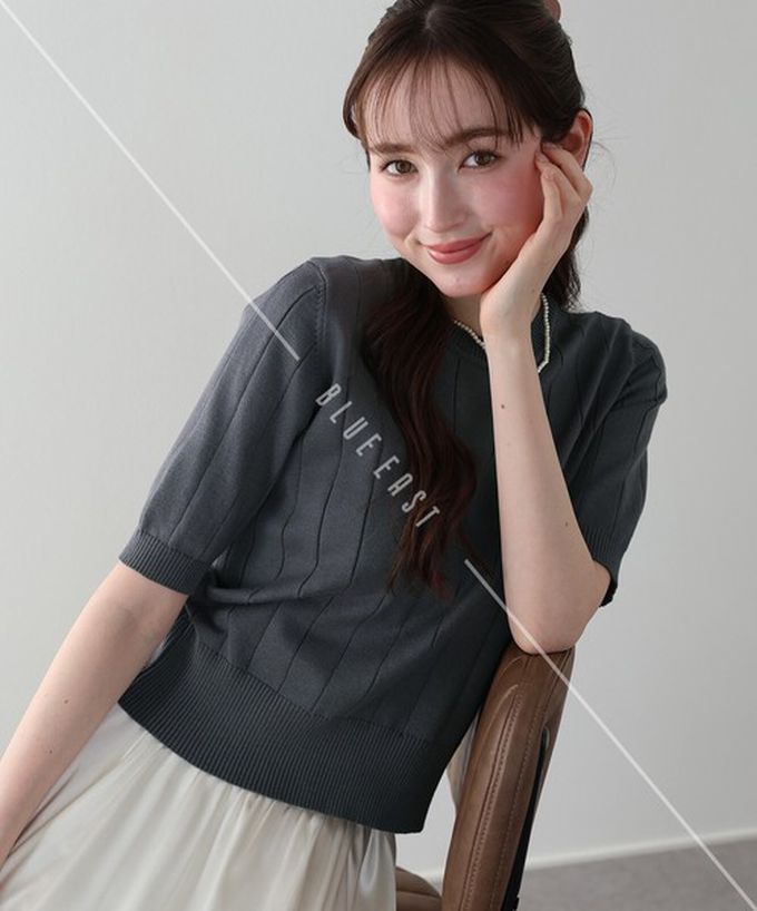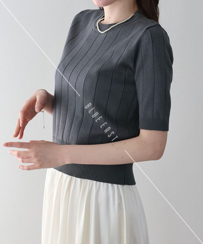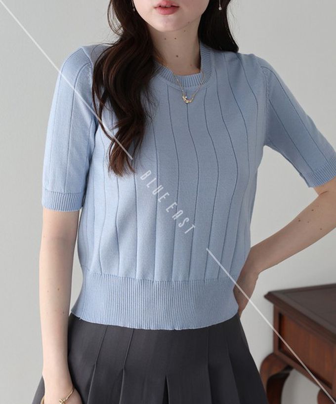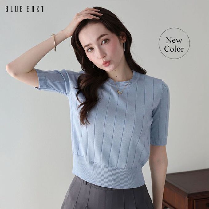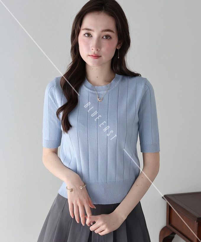 日本 BLUE EAST - 羅紋彈性薄針織五分袖上衣-水藍