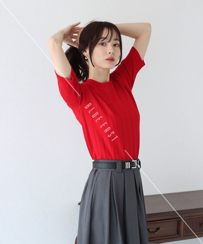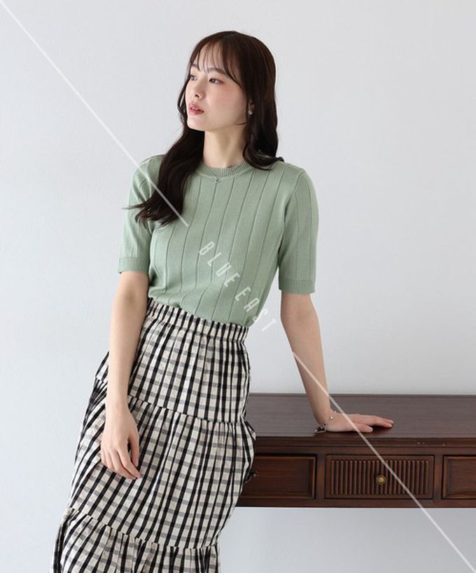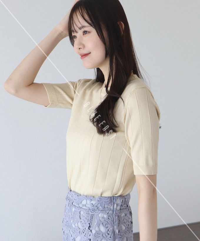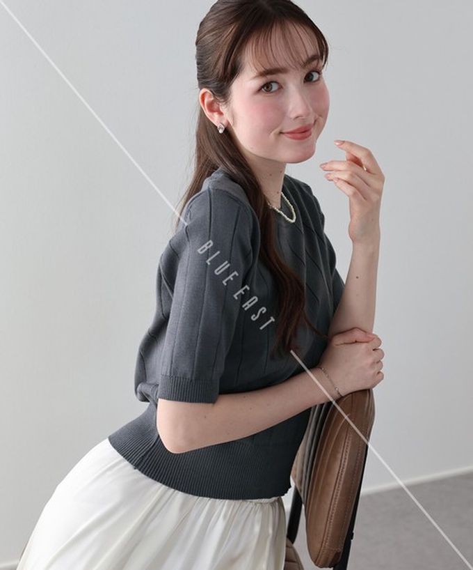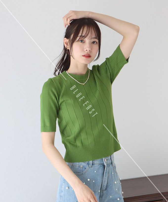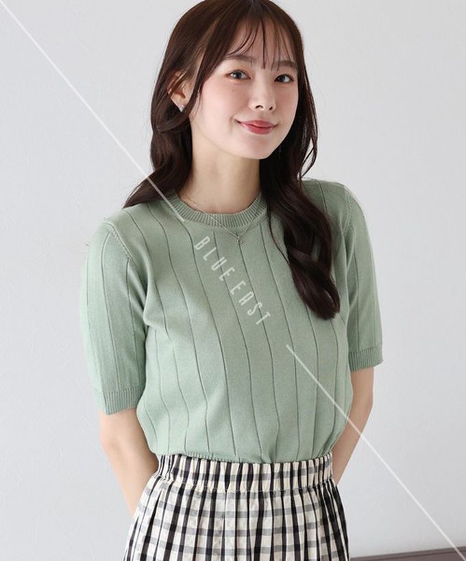 日本 BLUE EAST - 羅紋彈性薄針織五分袖上衣-水藍