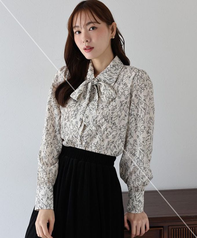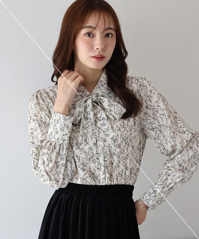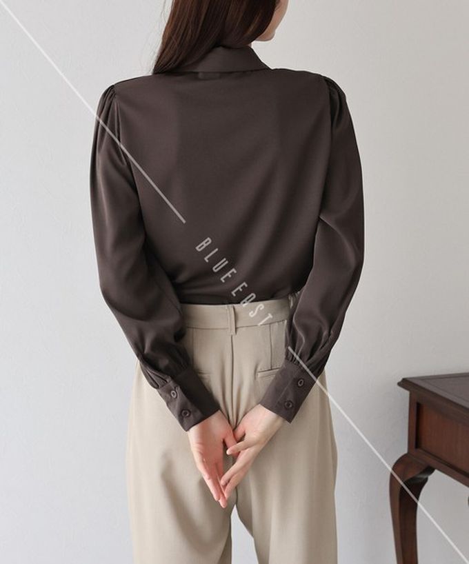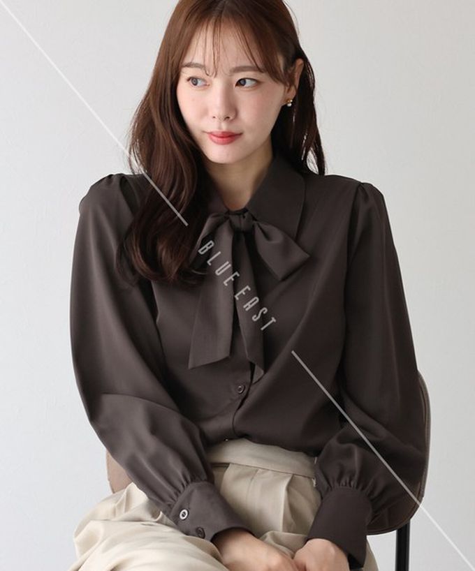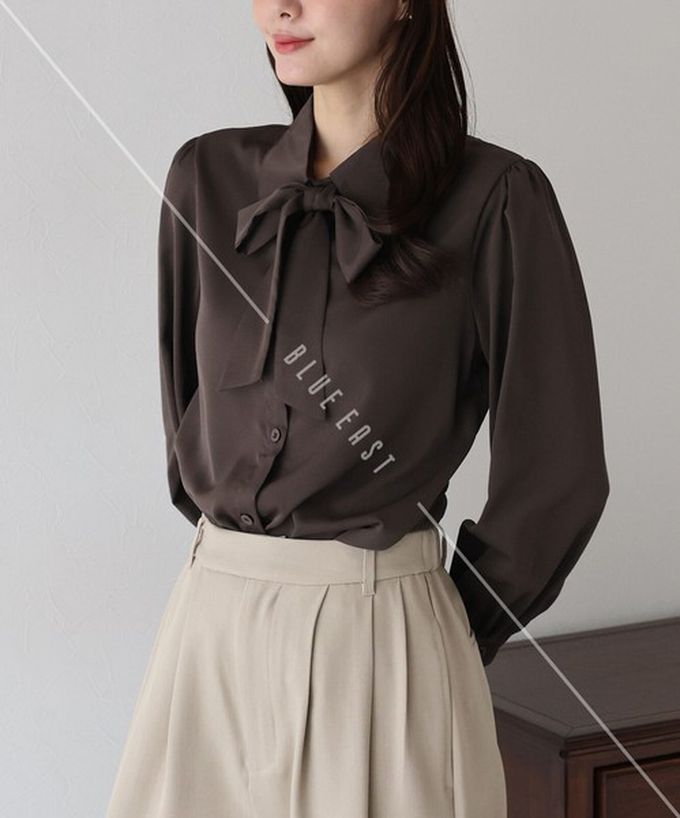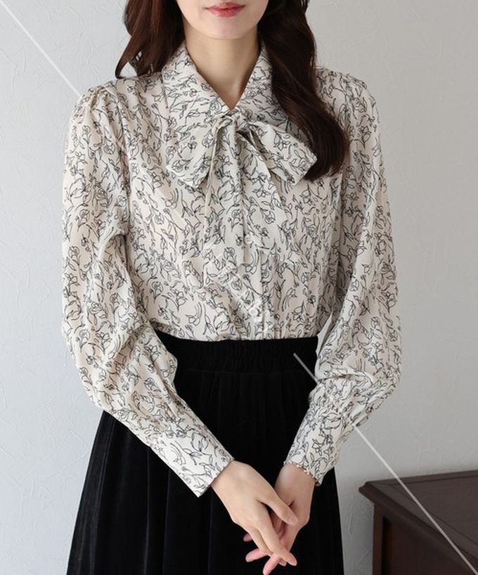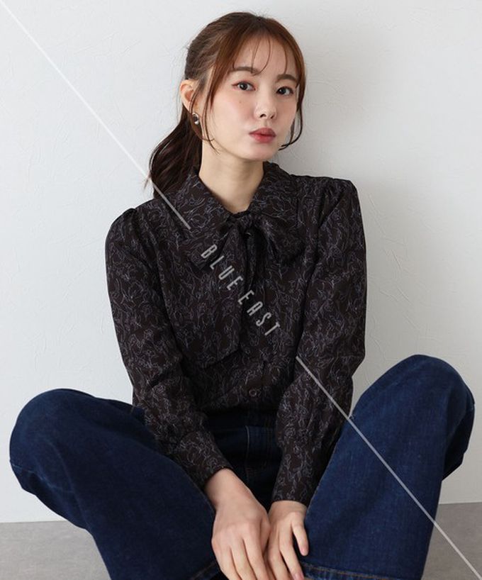 日本 BLUE EAST - 大人氣!優雅扭結雪紡長袖襯衫-線條花卉-深咖啡