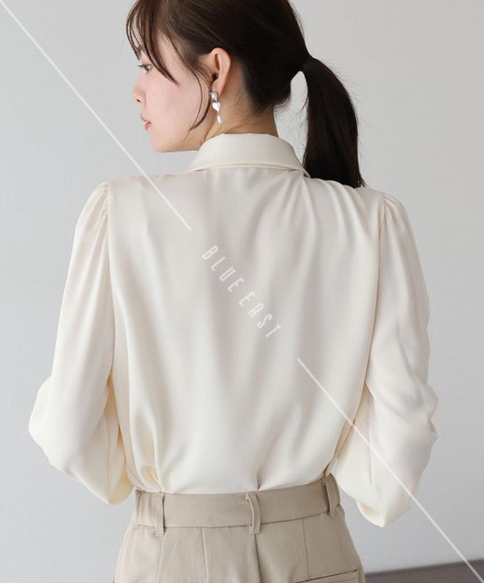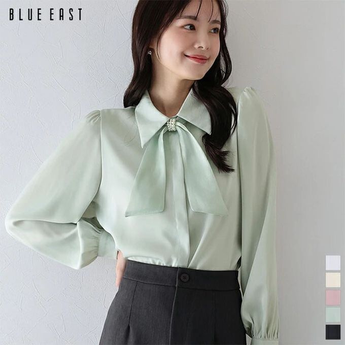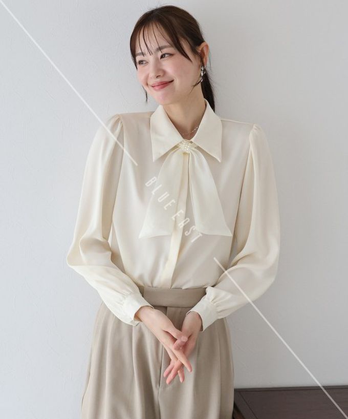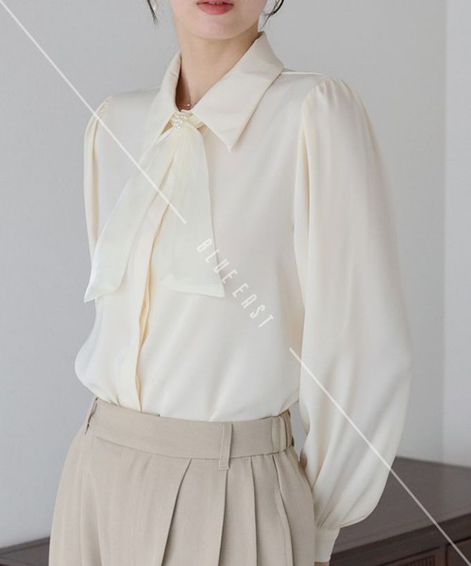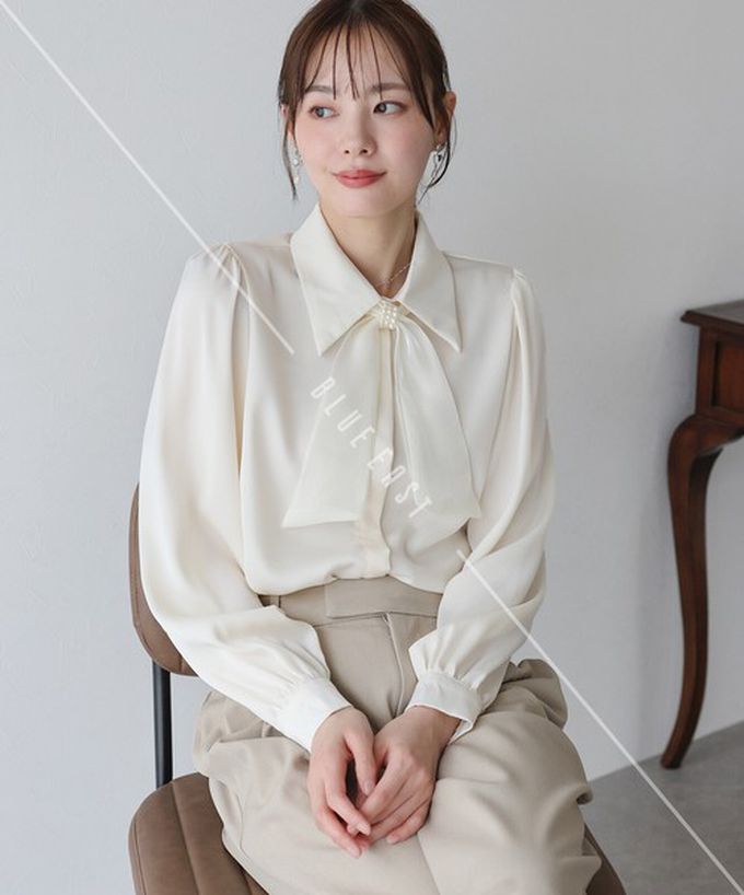 日本 BLUE EAST - 華美珍珠墜飾蝴蝶結緞面長袖襯衫-米杏 (M)