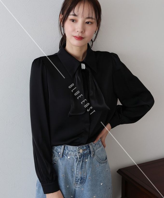 日本 BLUE EAST - 華美珍珠墜飾蝴蝶結緞面長袖襯衫-黑 (M)