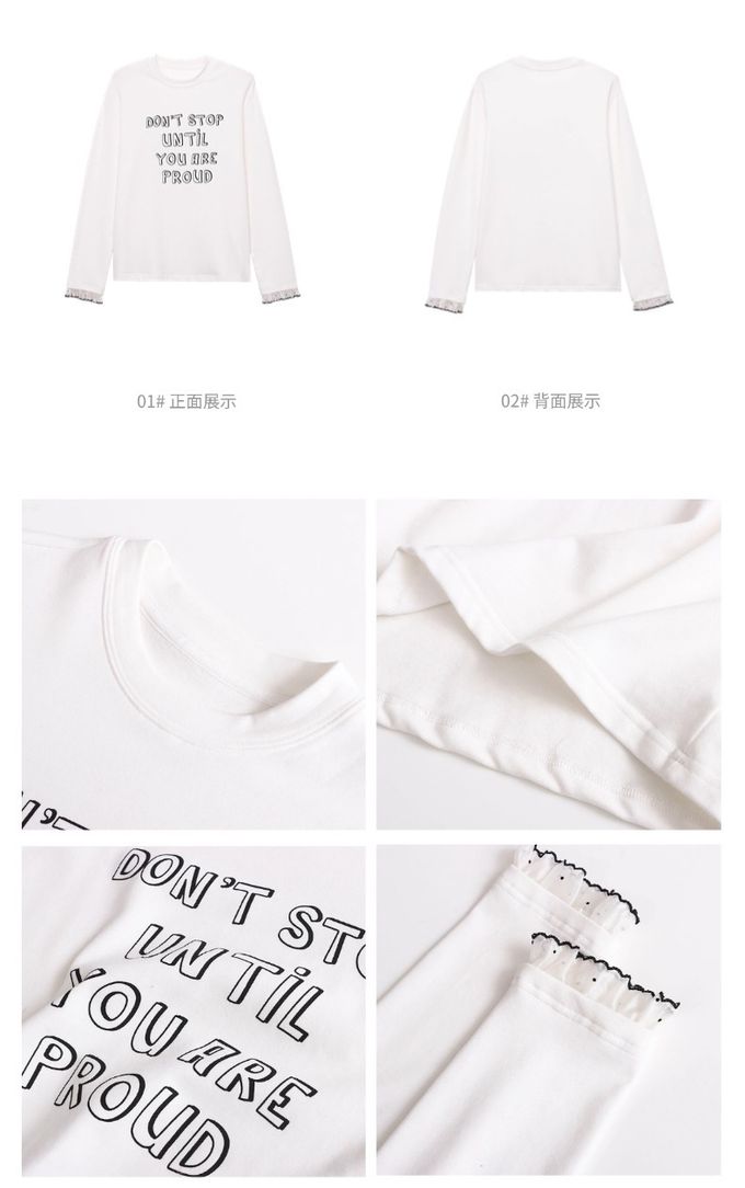 • 品名:字母印花蕾絲花邊點綴長袖上衣