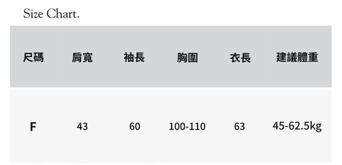 1. 尺寸表單位皆為公分(cm),商品皆為平鋪測量,實際尺寸會因布料彈性、水洗、測量起迄點等因素略有誤差,敬請諒解。