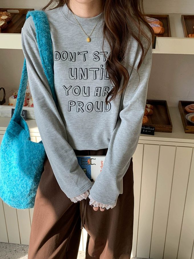 3th Morning - 字母印花蕾絲花邊點綴長袖上衣-淺灰 (F)