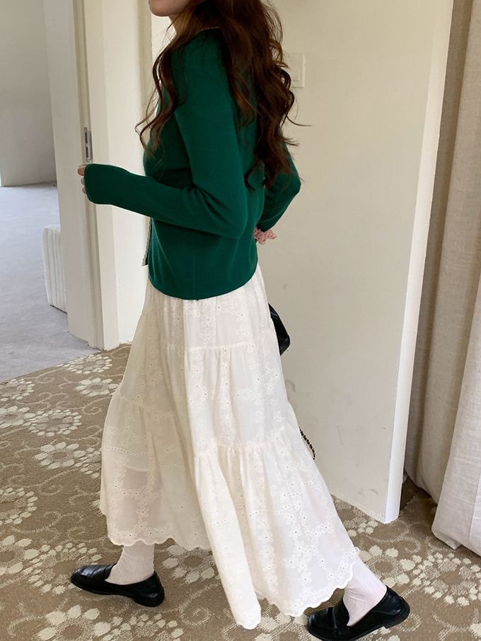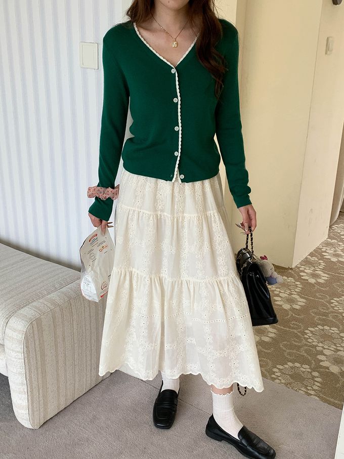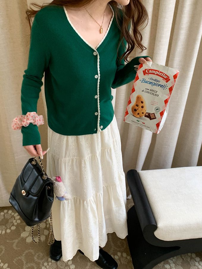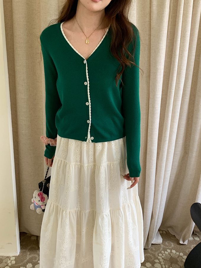 3th Morning - 撞色鈎花顯瘦V領長袖針織外套-綠 (F)
