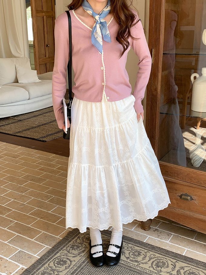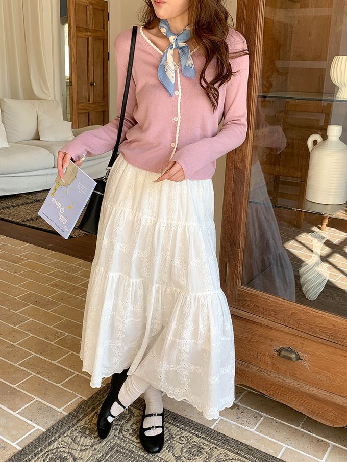 • 品名:撞色鈎花顯瘦V領長袖針織外套