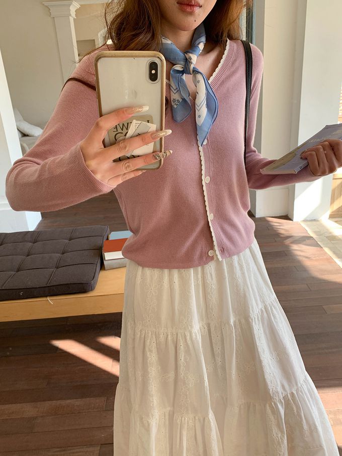 3th Morning - 撞色鈎花顯瘦V領長袖針織外套-粉紫 (F)