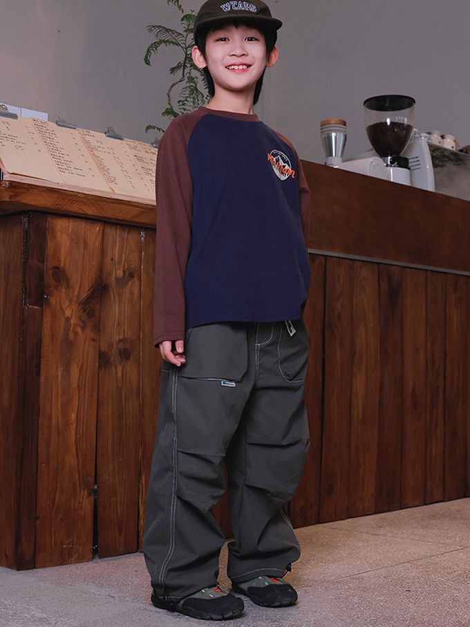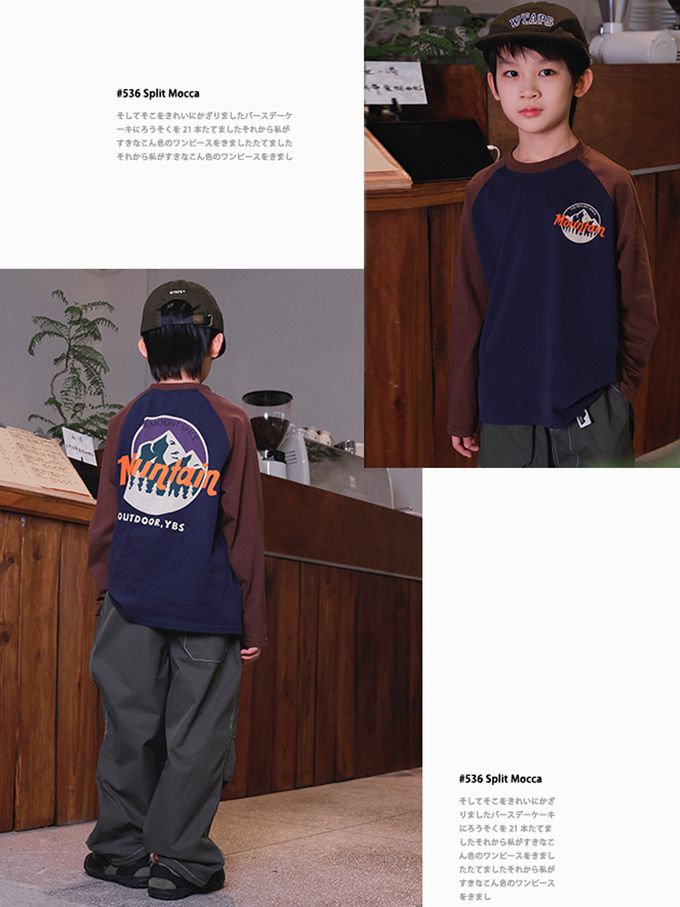 Y B S - 純棉圓領長袖上衣-一起去露營-拼袖杏