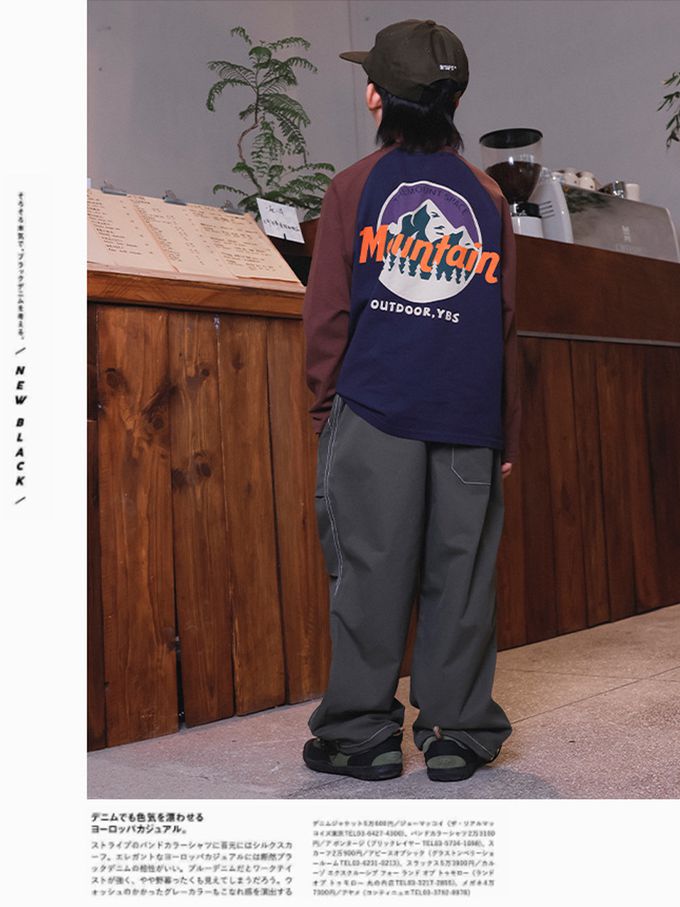 Y B S - 純棉圓領長袖上衣-一起去露營-拼袖黑