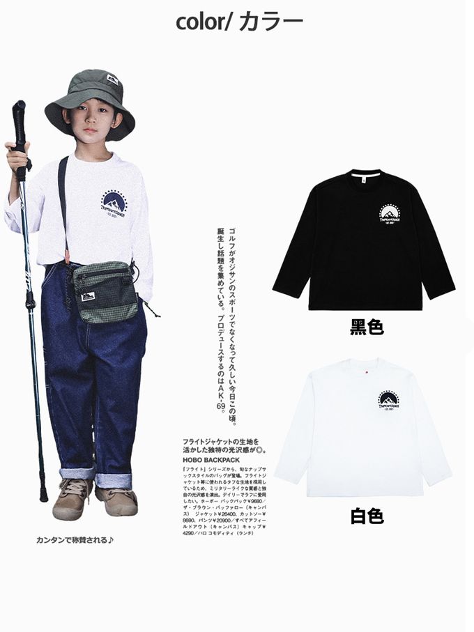Y B S - 純棉圓領長袖上衣-一起去露營-拼袖黑