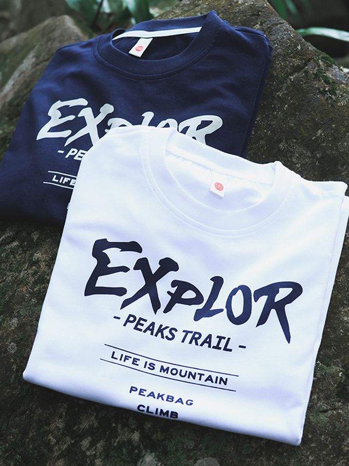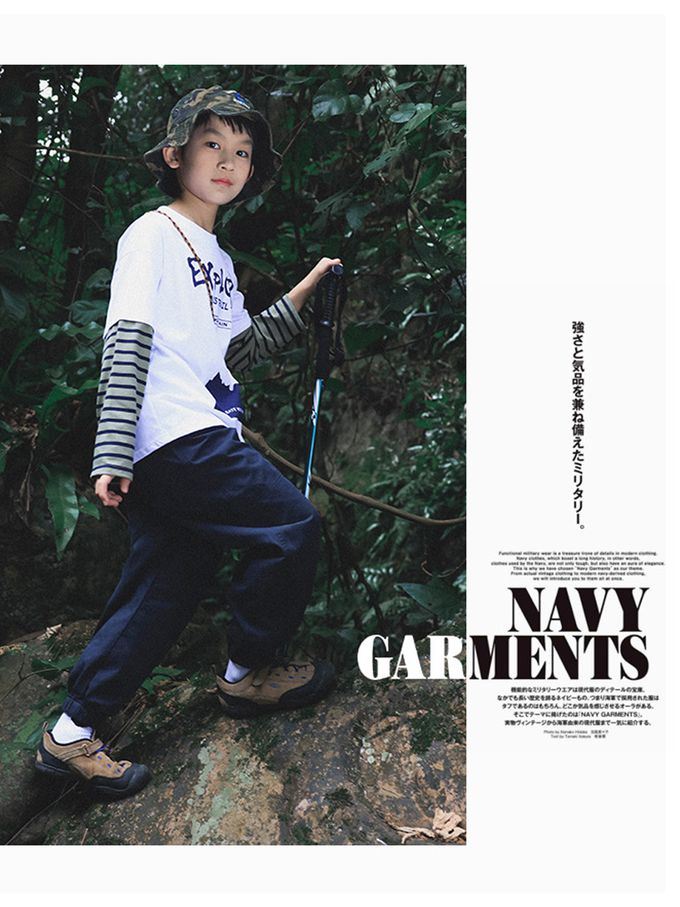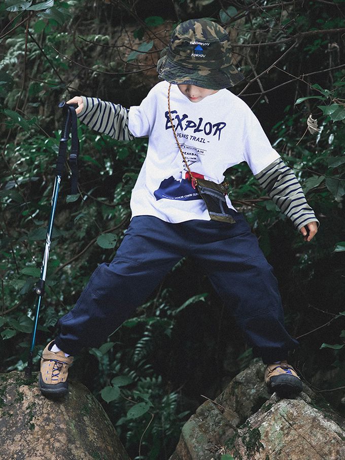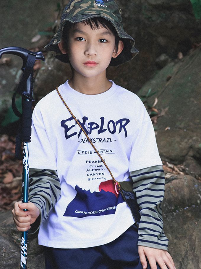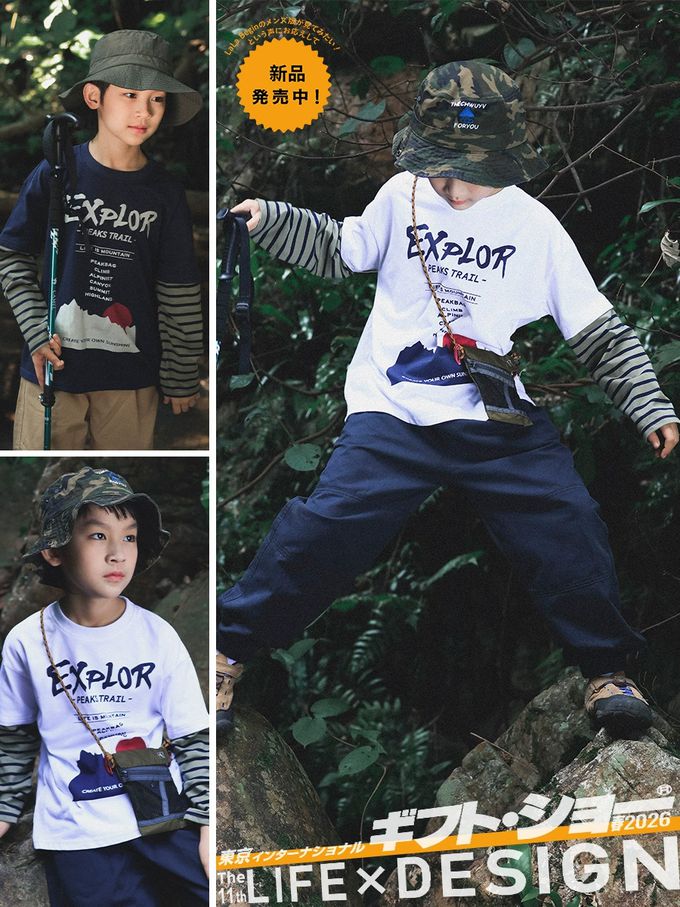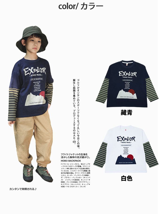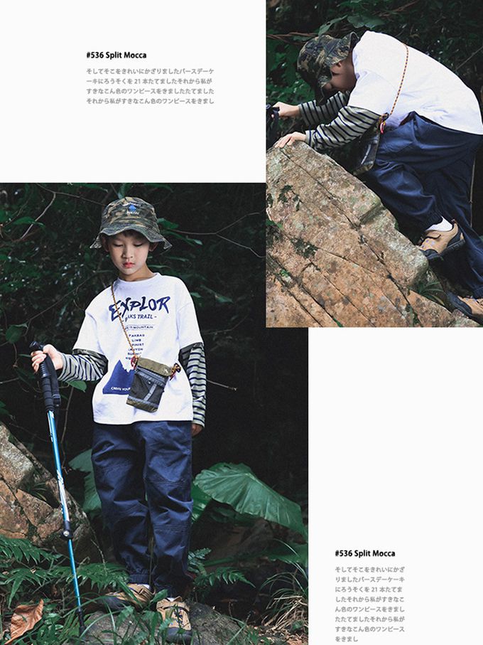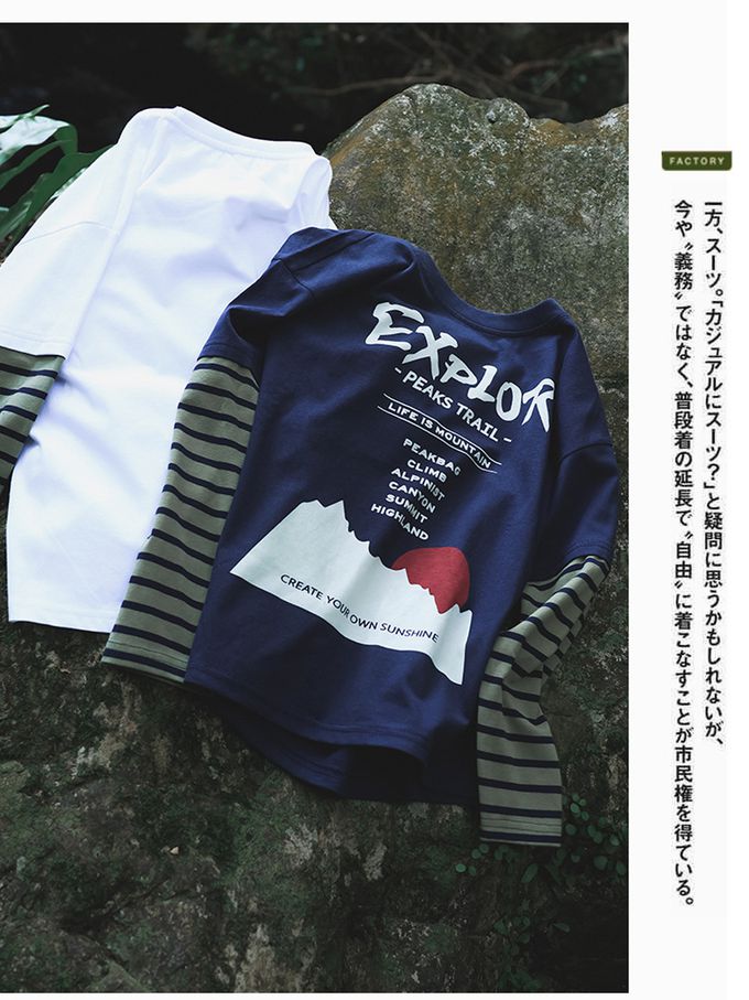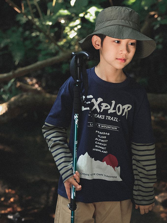 Y B S - 純棉圓領長袖上衣-一起去露營-拼袖杏