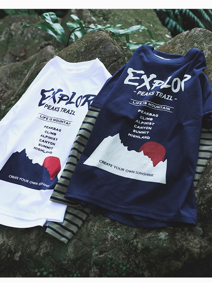 純棉圓領長袖上衣-假兩件拼袖-白色
