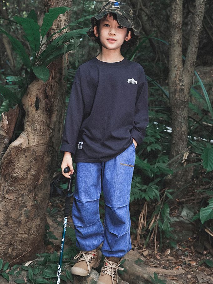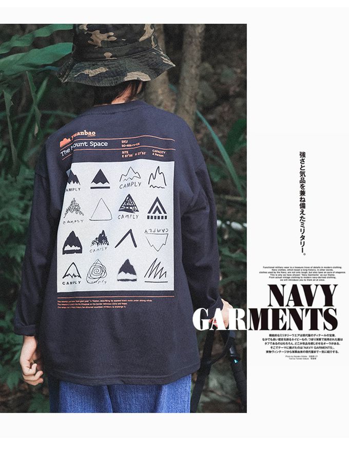 Y B S - 純棉圓領長袖上衣-一起去露營-拼袖黑