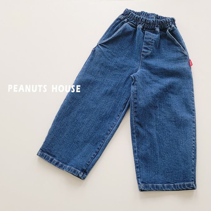 韓國南大門童裝 - Peanuts House 鬆緊腰紅標點綴丹寧長褲-深藍