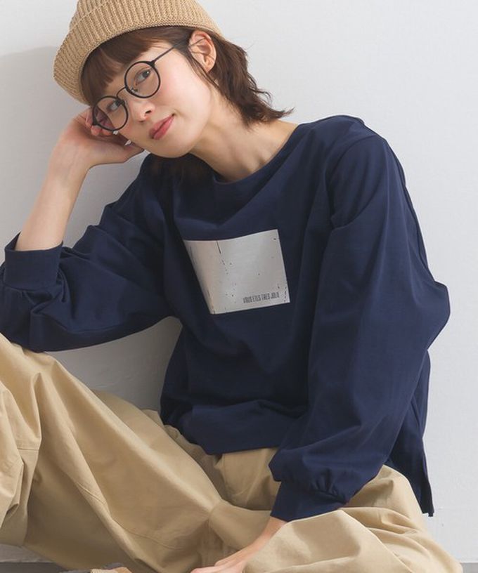 日本 Lupilien - 100%棉 光澤感銀箔裝飾長袖上衣-海軍藍