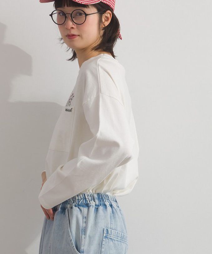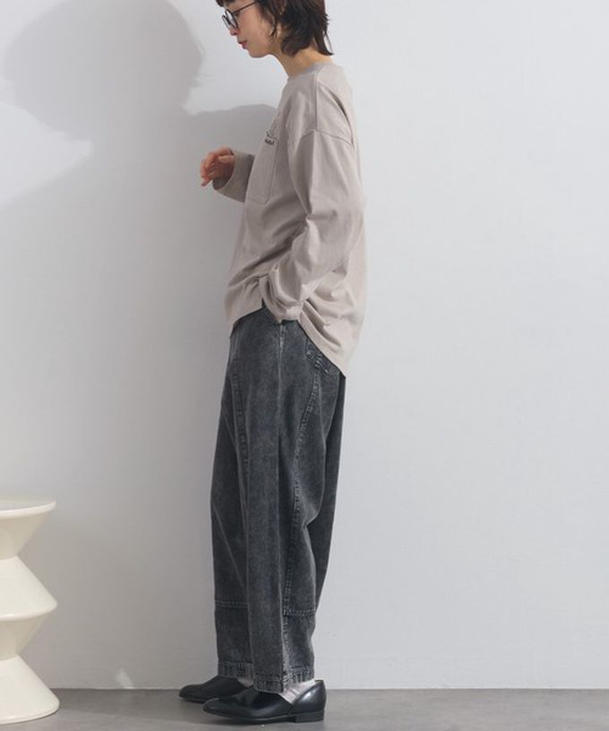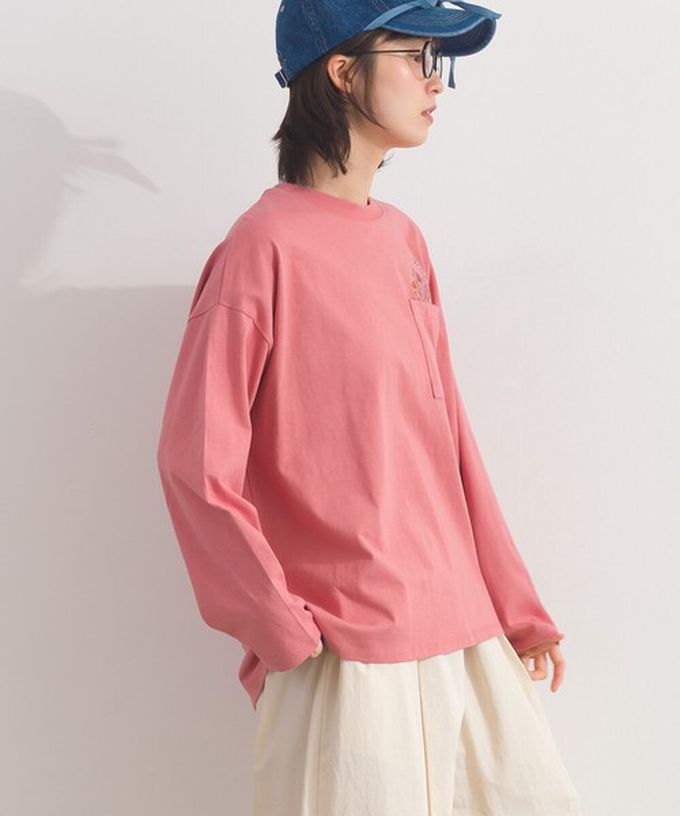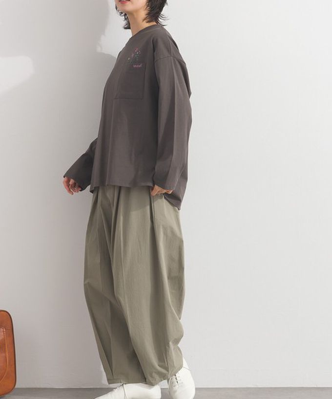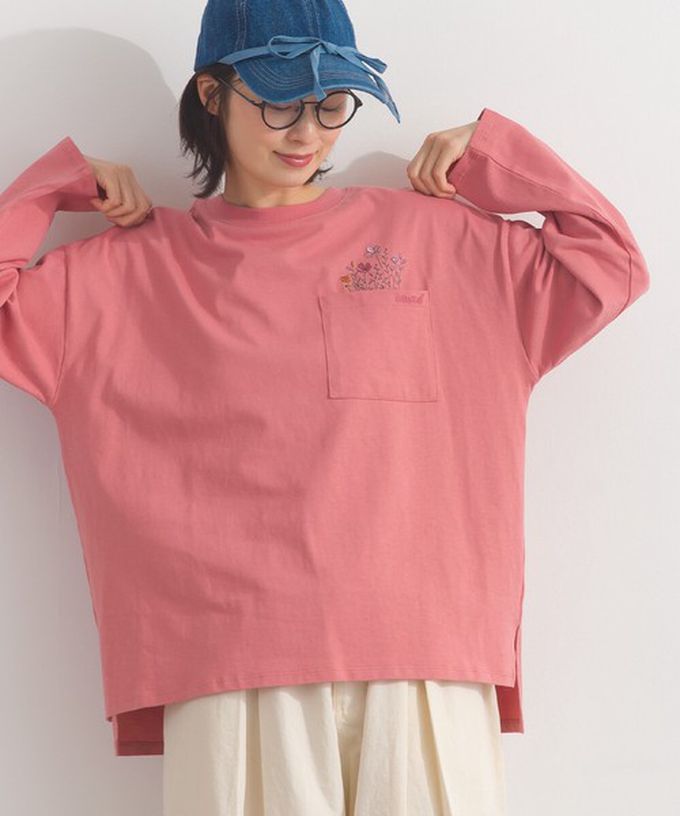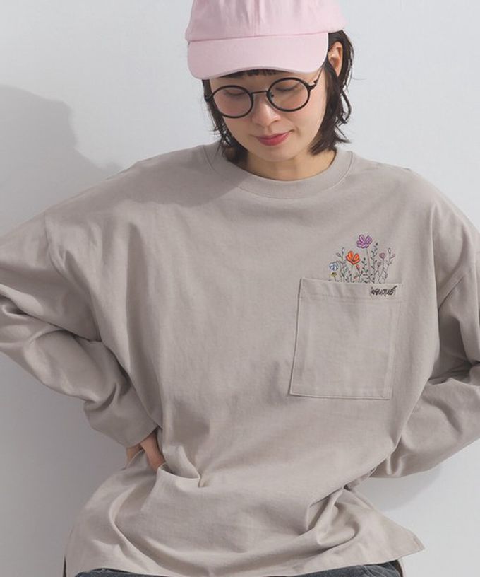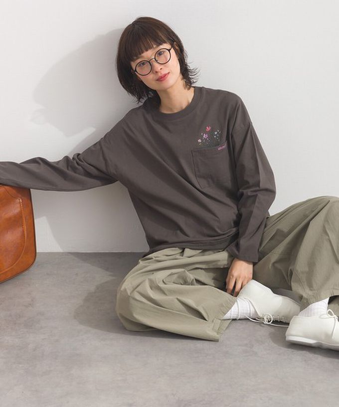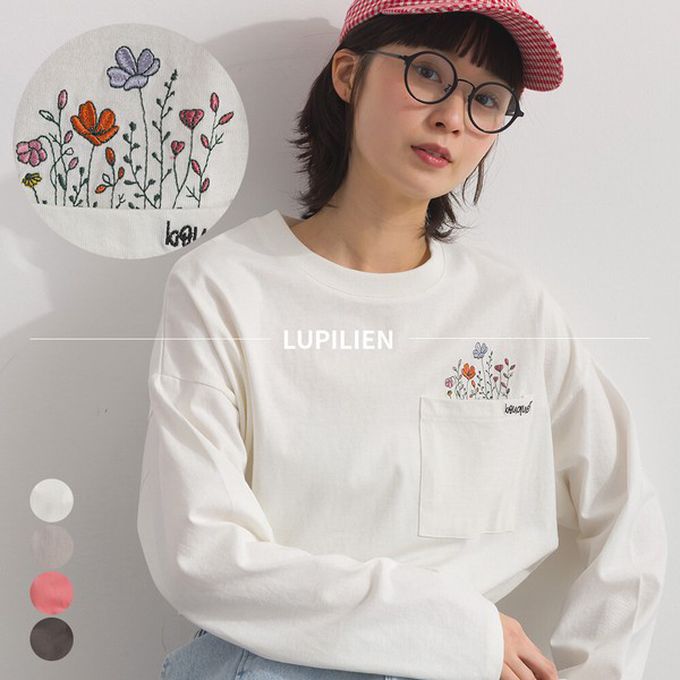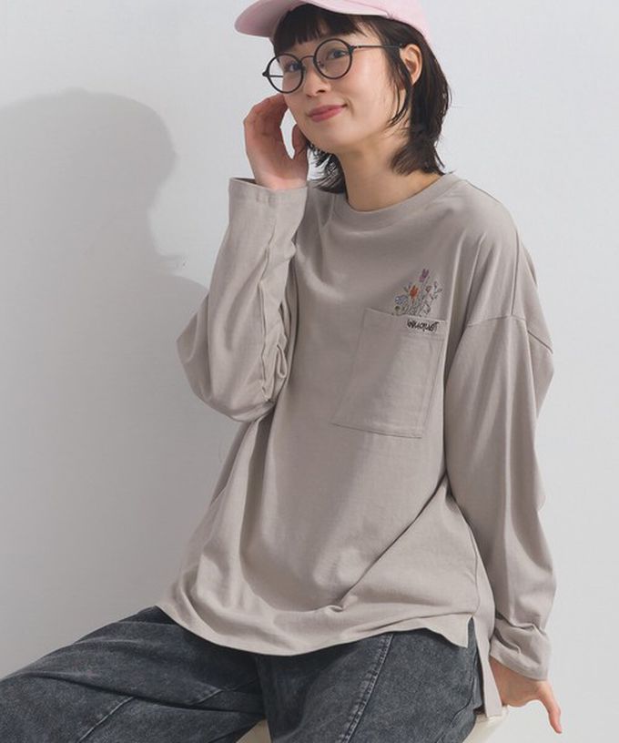 日本 Lupilien - 彩色刺繡花卉口袋純棉長袖上衣-灰棕