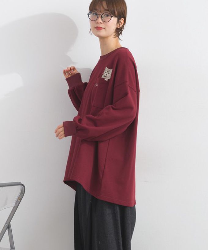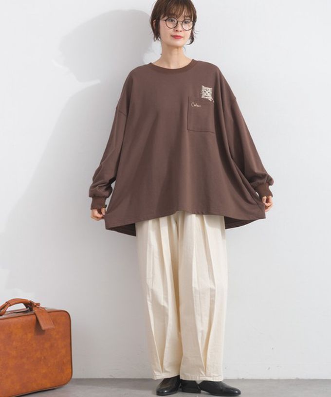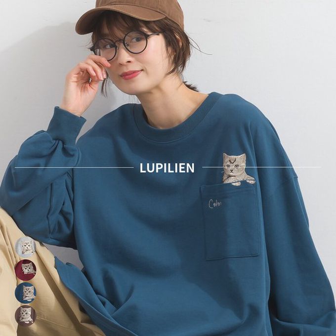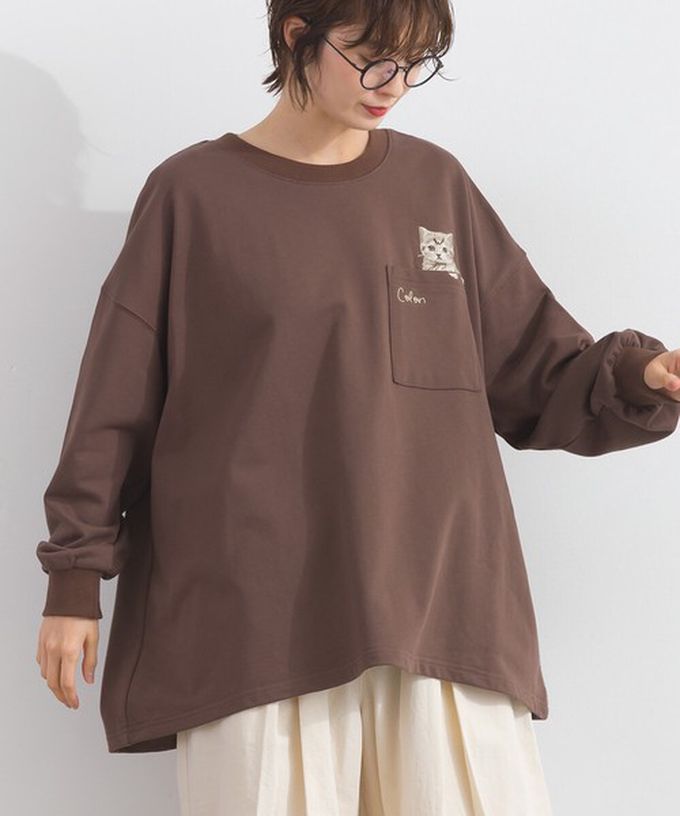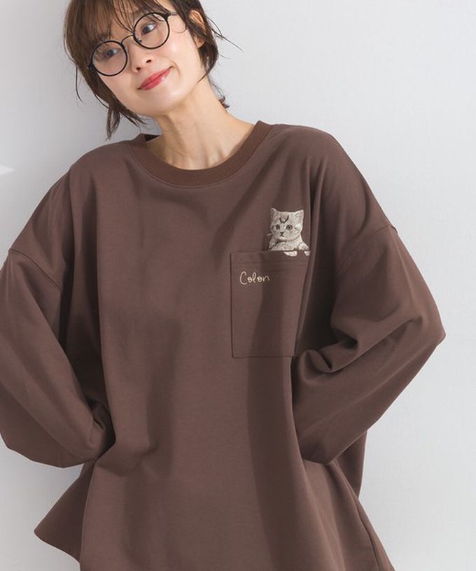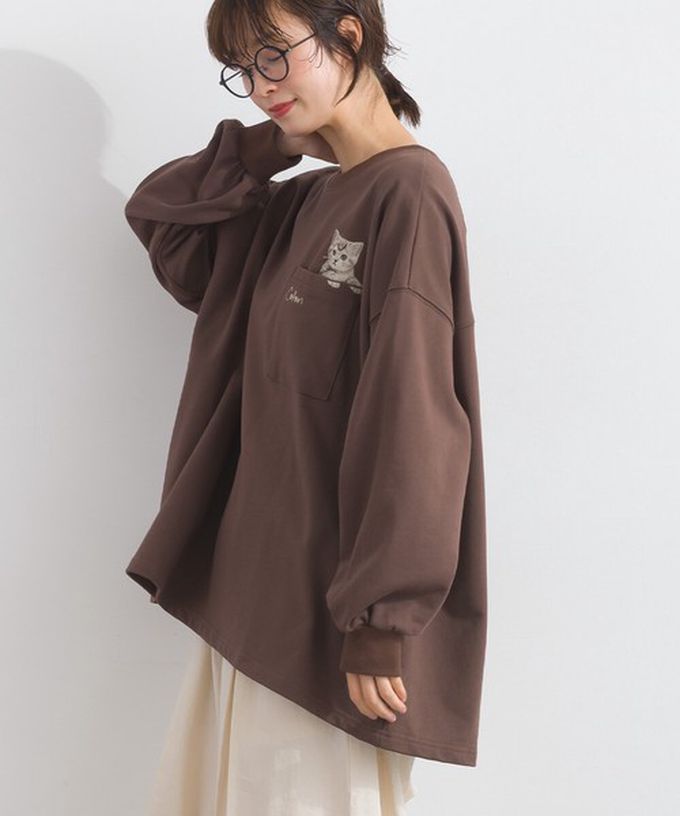 日本 Lupilien - 可愛貓咪探頭口袋裏毛長版T恤-咖啡