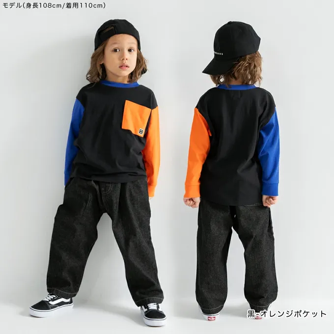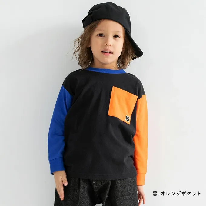 日本 BRANSHES - 100%棉 簡約口袋長袖上衣-橘藍撞色-黑