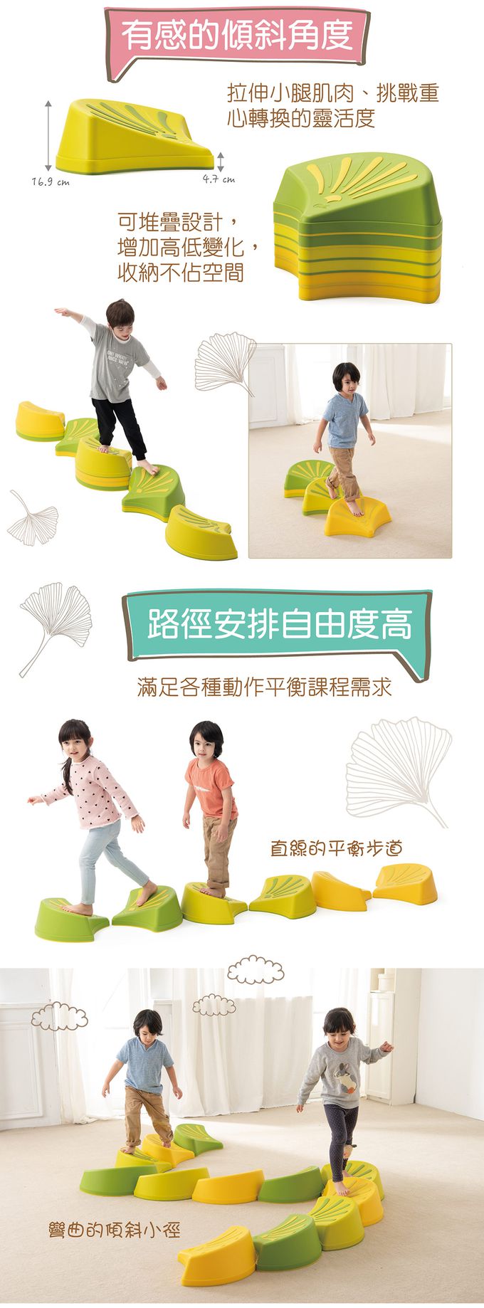 - 一組有六塊,使用者可依需求自由地轉換路徑傾斜的方向,練習身體重心轉移的靈活度。