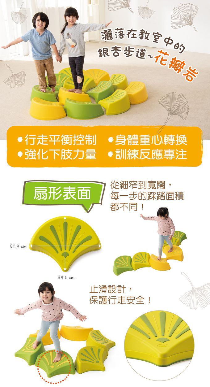 - 表面止滑條設計,保護行走安全,也提供腳底觸覺體驗。