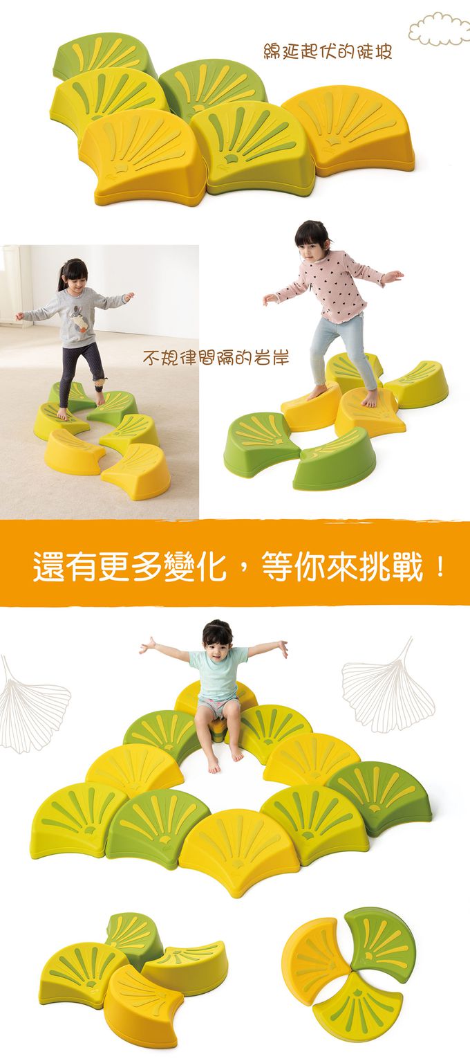 - 花瓣岩可卡合疊高,創造高低落差的挑戰步道,強化下肢力量。