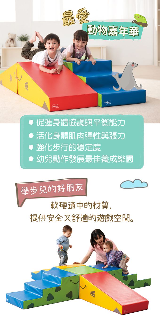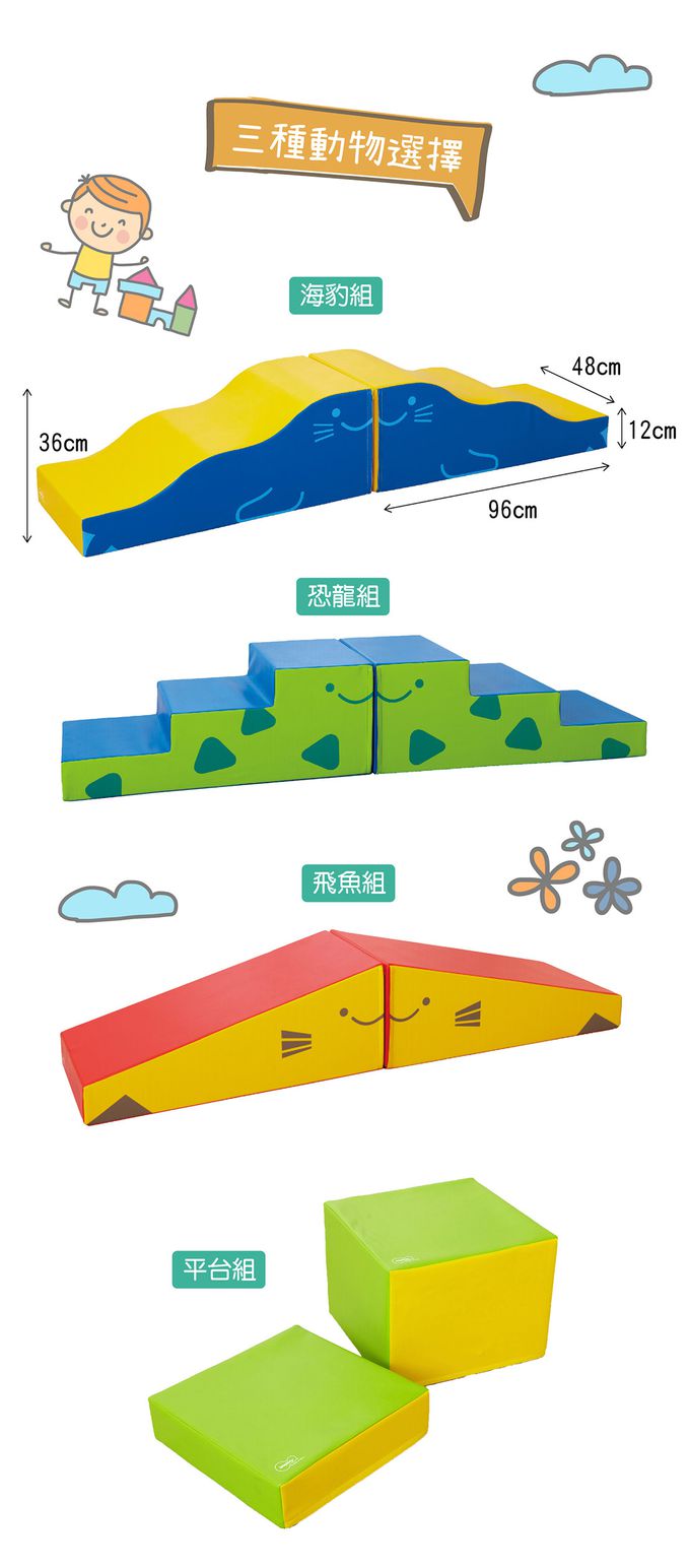 商品尺寸:恐 龍-長96cm × 寬48cm × 高36cm/單個飛 魚-長96cm × 寬48cm × 高36cm/單個海 豹-長96cm × 寬48cm × 高36cm/單個高平台-長48cm × 寬48cm × 高36cm低平台-長48cm × 寬48cm × 高12cm組件明細:恐龍2件、飛魚2件、海豹2件、平台2件(共8件)商品材質:無添加PVC(不含鄰苯二甲酸)、PE發泡(低甲醯胺)產地:台灣★通過歐盟CE產品品質認證與美國ASTM安規
