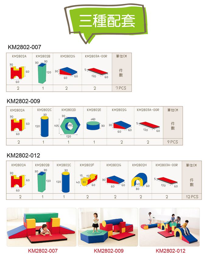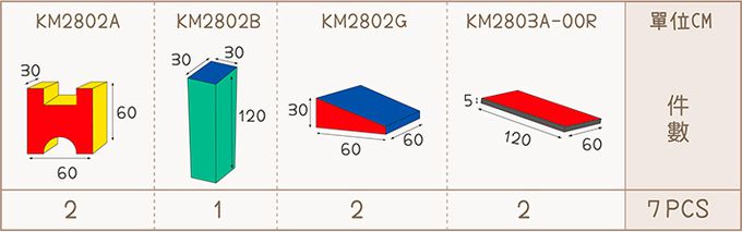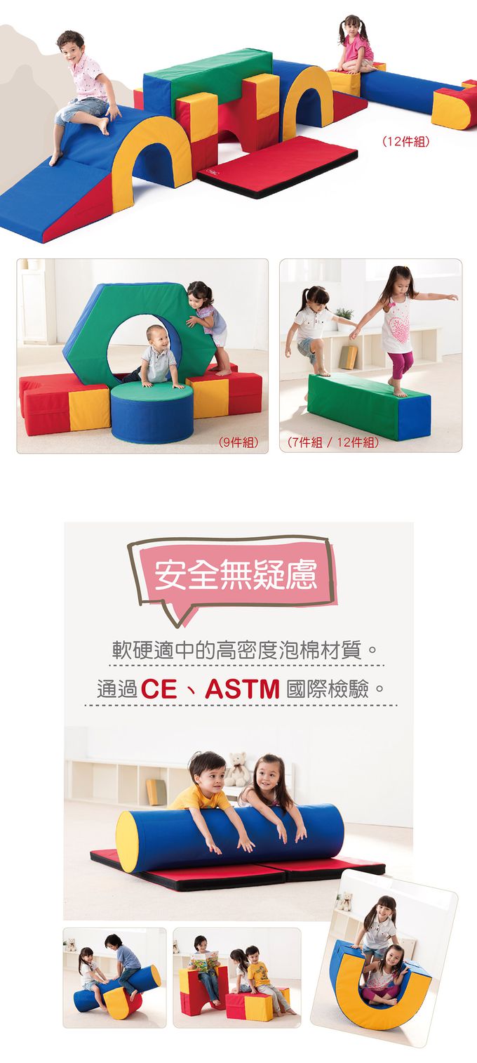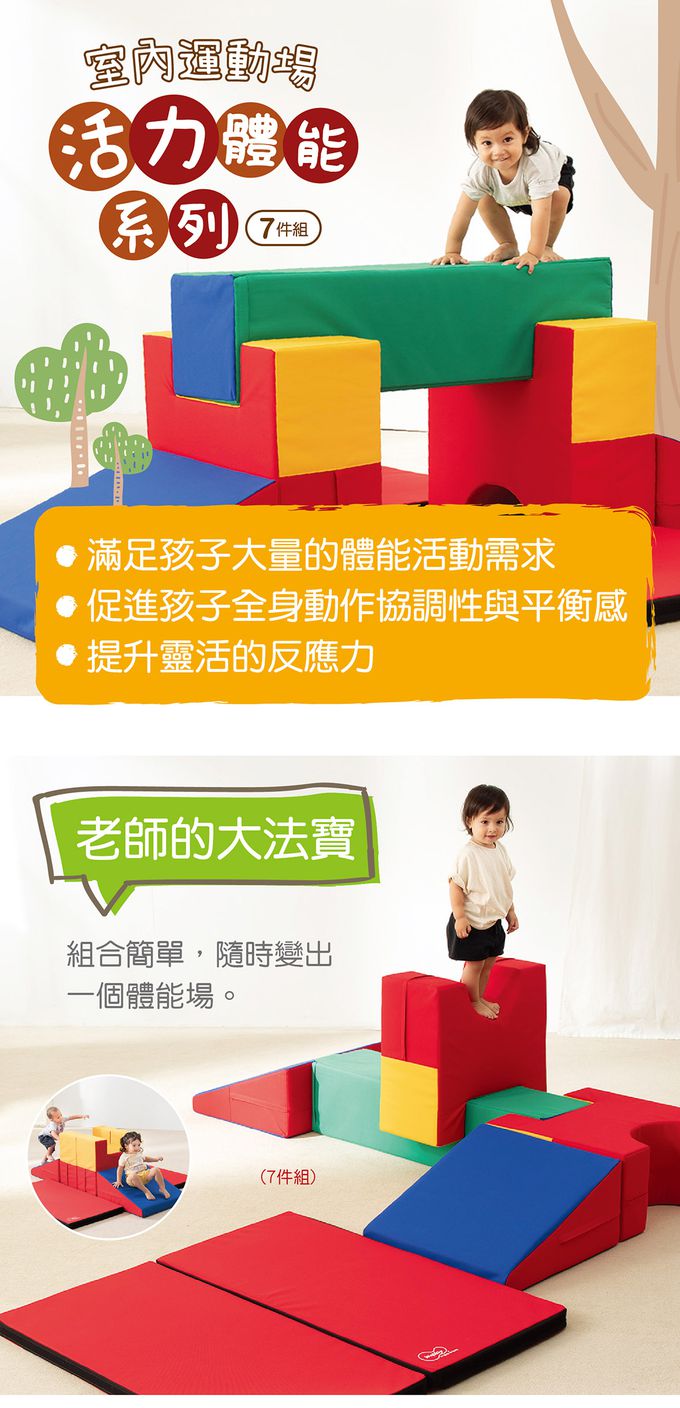 • 大型的體能遊戲組件,可自由創意組合路徑,山洞、方柱、斜坡…,能輕鬆建構墊上體能遊戲。