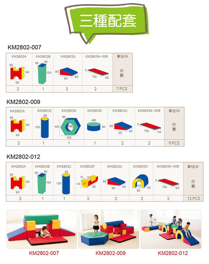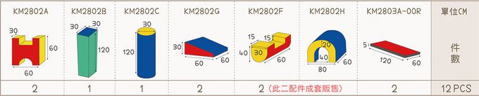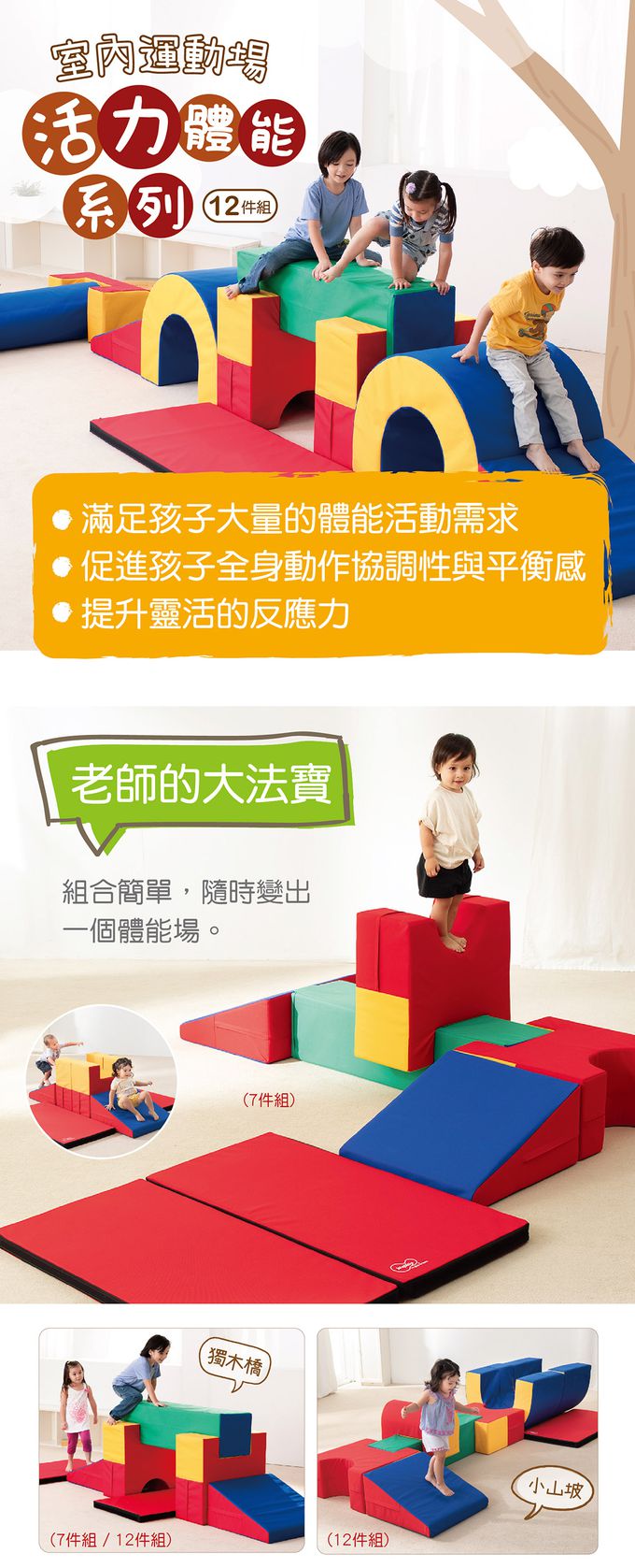 • 大型的體能遊戲組件,可自由創意組合路徑,山洞、方柱、斜坡…,能輕鬆建構墊上體能遊戲。