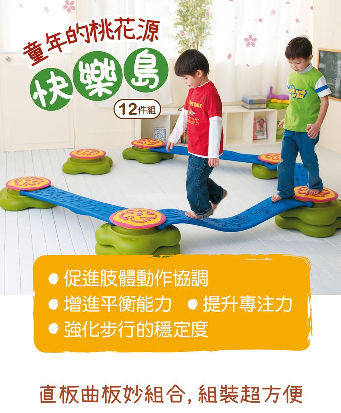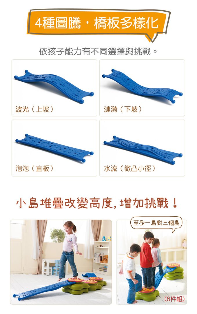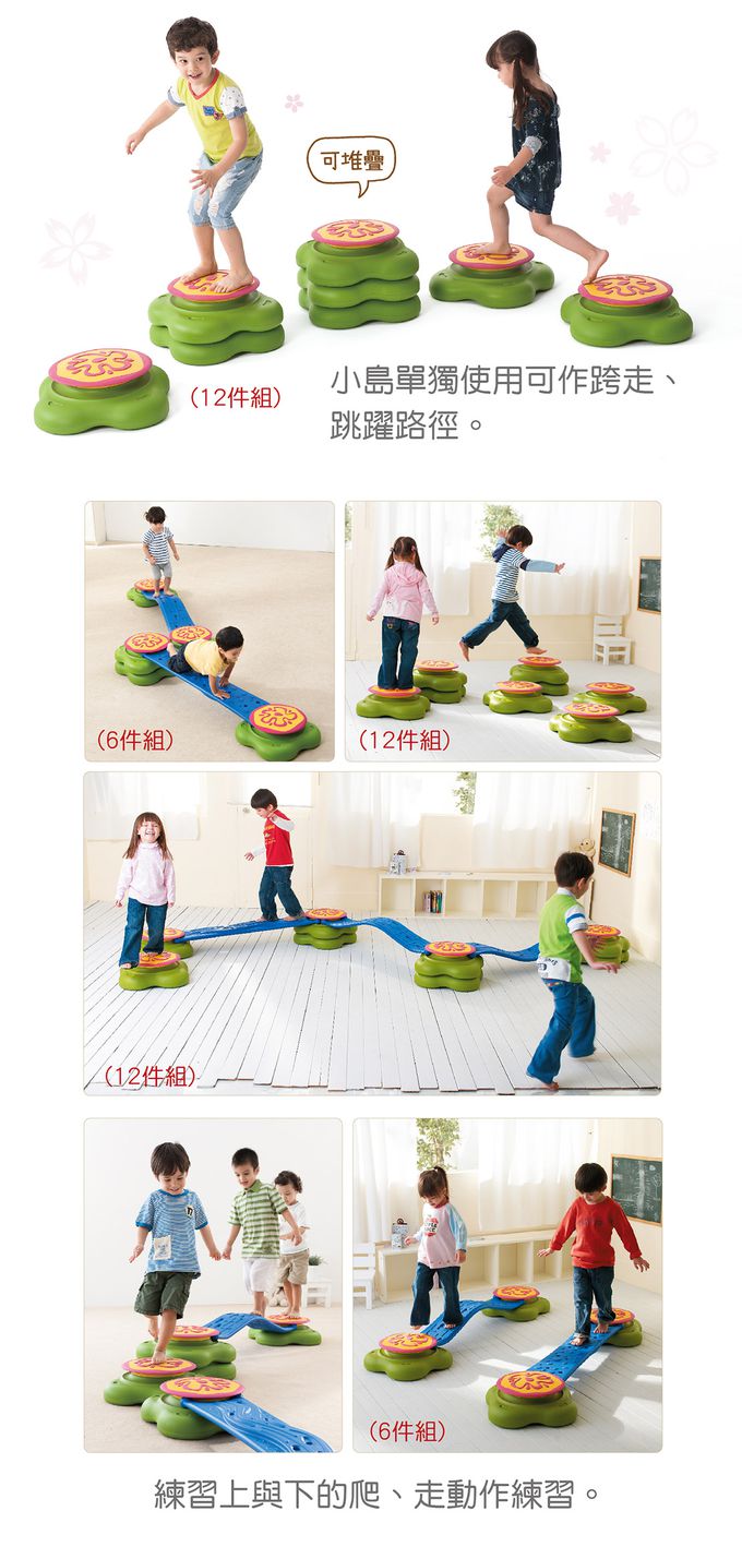 - 小島可單獨堆疊變化高度,給孩子不同的跨走、跳躍經驗。