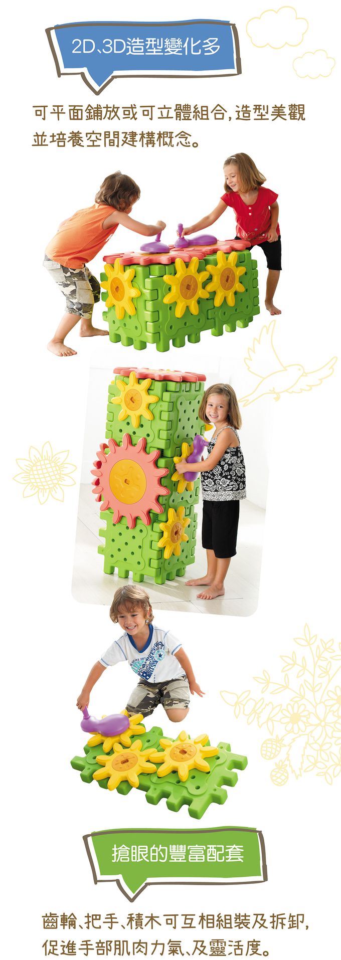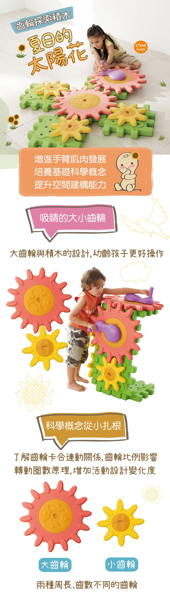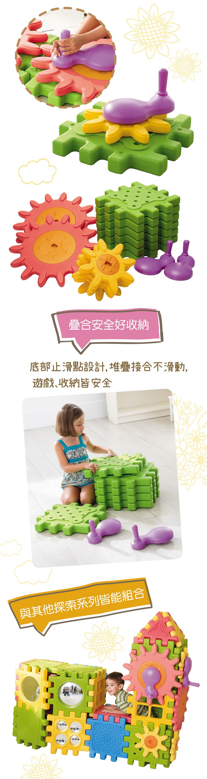 商品尺寸:積木底板-長40cm × 寬40cm × 高5cm大 齒 輪-直徑52cm 小 齒 輪-直徑30cm手 把-長27cm × 寬15cm組件明細:積木底板6片、大齒輪2片、小齒輪4片、手把2片,共14片。商品材質:PP、PE、TPE產地:台灣★通過歐盟CE產品品質認證與美國ASTM安規