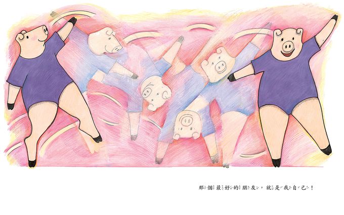故事以第一人稱書寫,語氣親切自然,就像小孩在對自己說話。文字簡潔卻充滿力量,每一句都在傳遞「我很好,我值得被喜歡」的信念。對年幼的讀者來說,這樣的語言不僅容易理解,也能在潛移默化中建立正向的自我形象。當小豬說出「我有一個最好的朋友。那個最好的朋友,就是我自己!」時,孩子會感受到一種由內而生的喜悅,而這正是成長過程中最珍貴的力量來源。