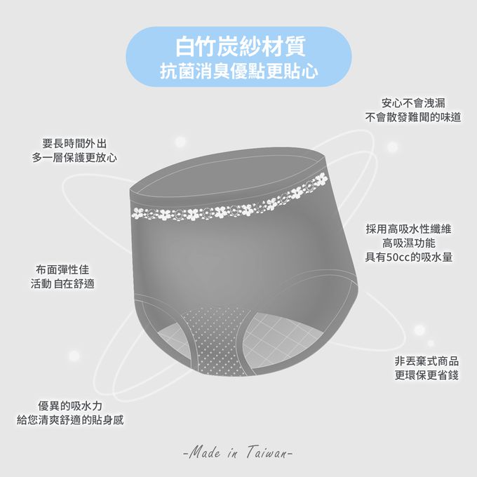 品名:2件組-女用白竹炭紗防漏尿保潔內褲(50cc輕失禁適用)